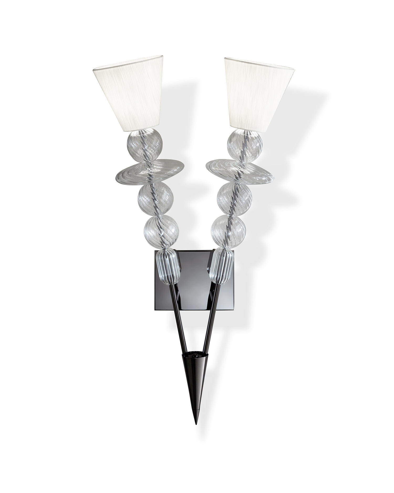 威尼斯"穆拉诺"吹制透明玻璃壁灯。2个"Murano"吹制透明玻璃臂,2个E14灯插入黑色镍钢中。