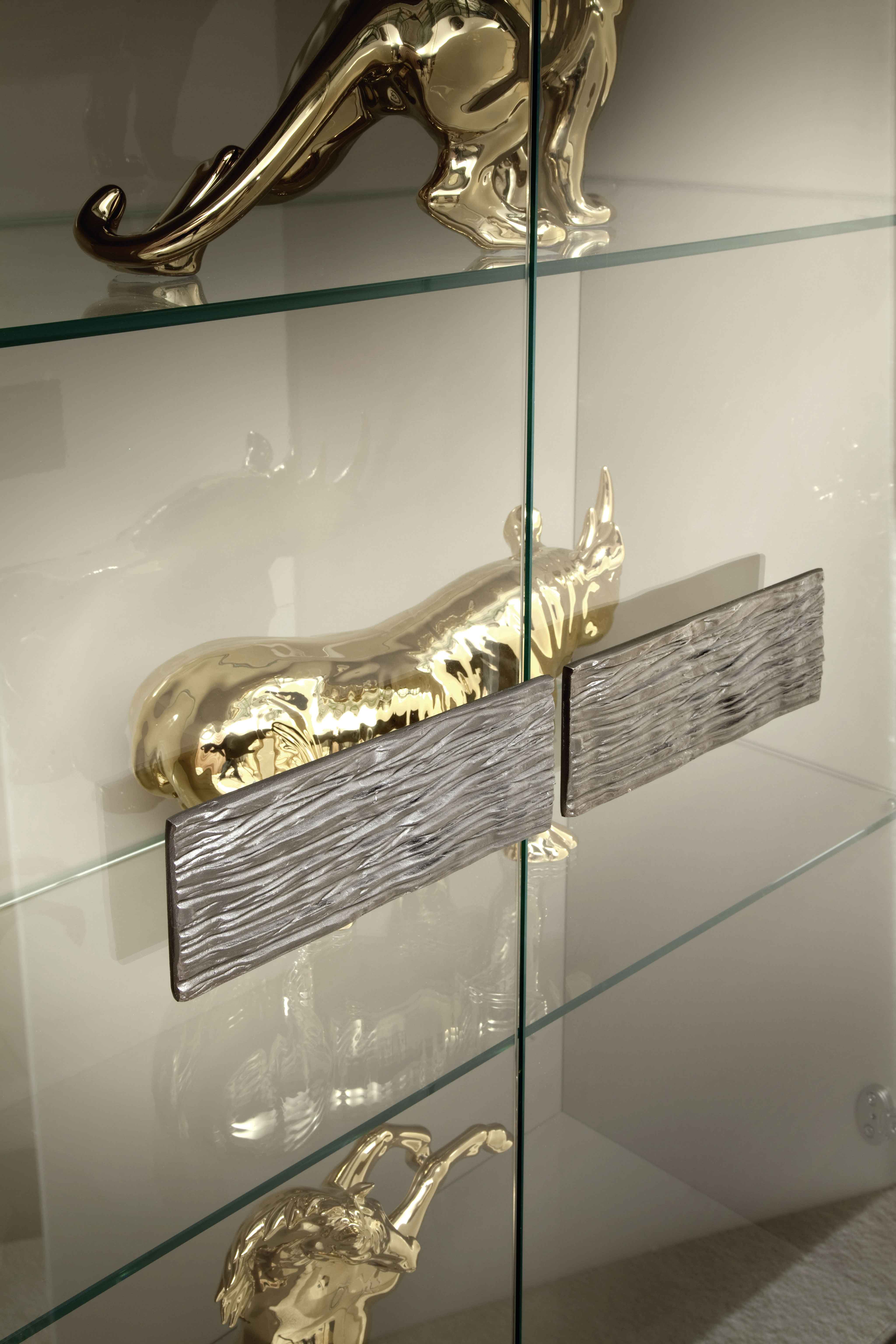 2个玻璃门Vetrine采用犰狳印刷皮革制成,带有2个可调节的玻璃搁板。侧面板和背板采用高光聚酯漆。2 个卤素 LED 灯,包括开关。2 个特殊青铜黄铜手柄。