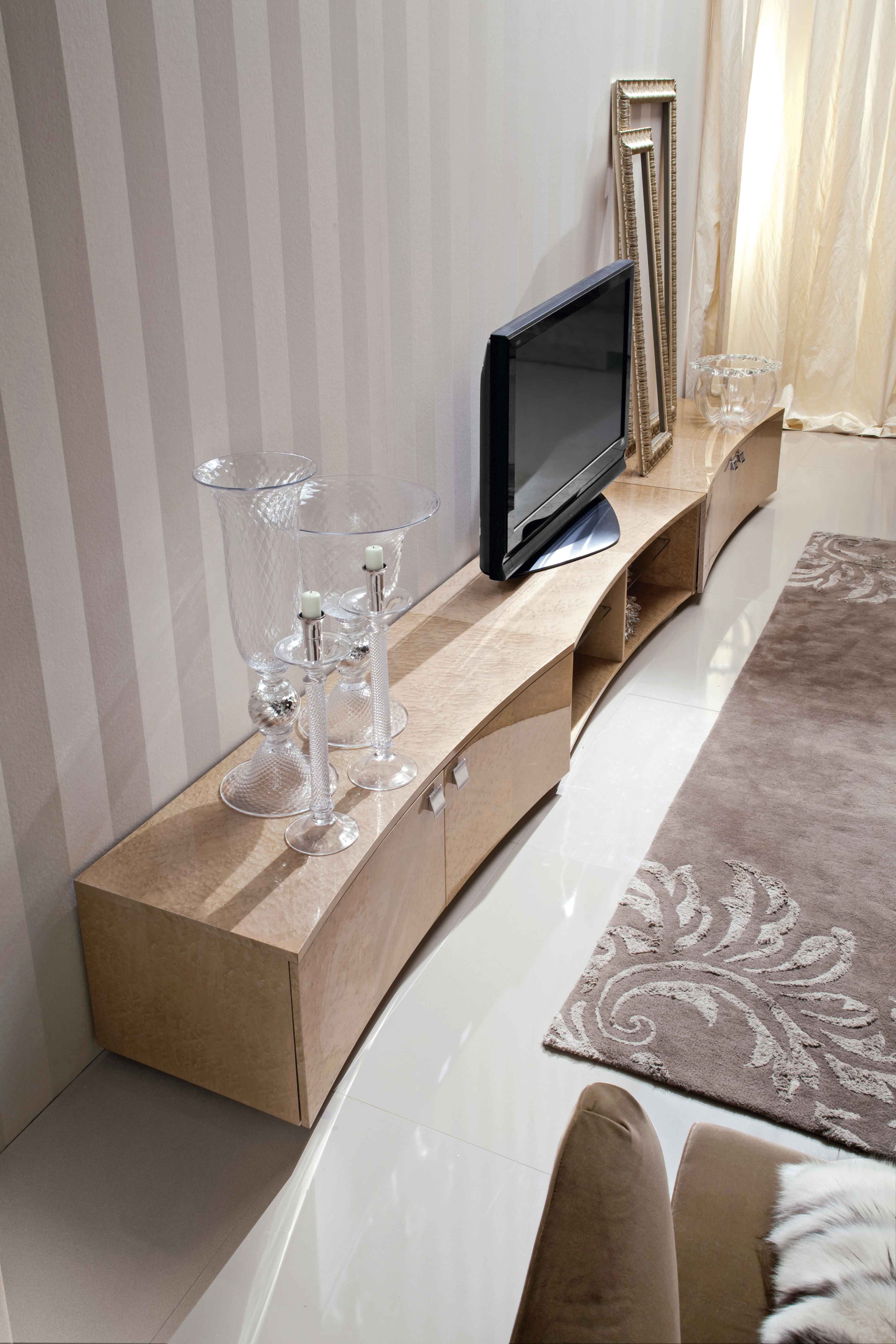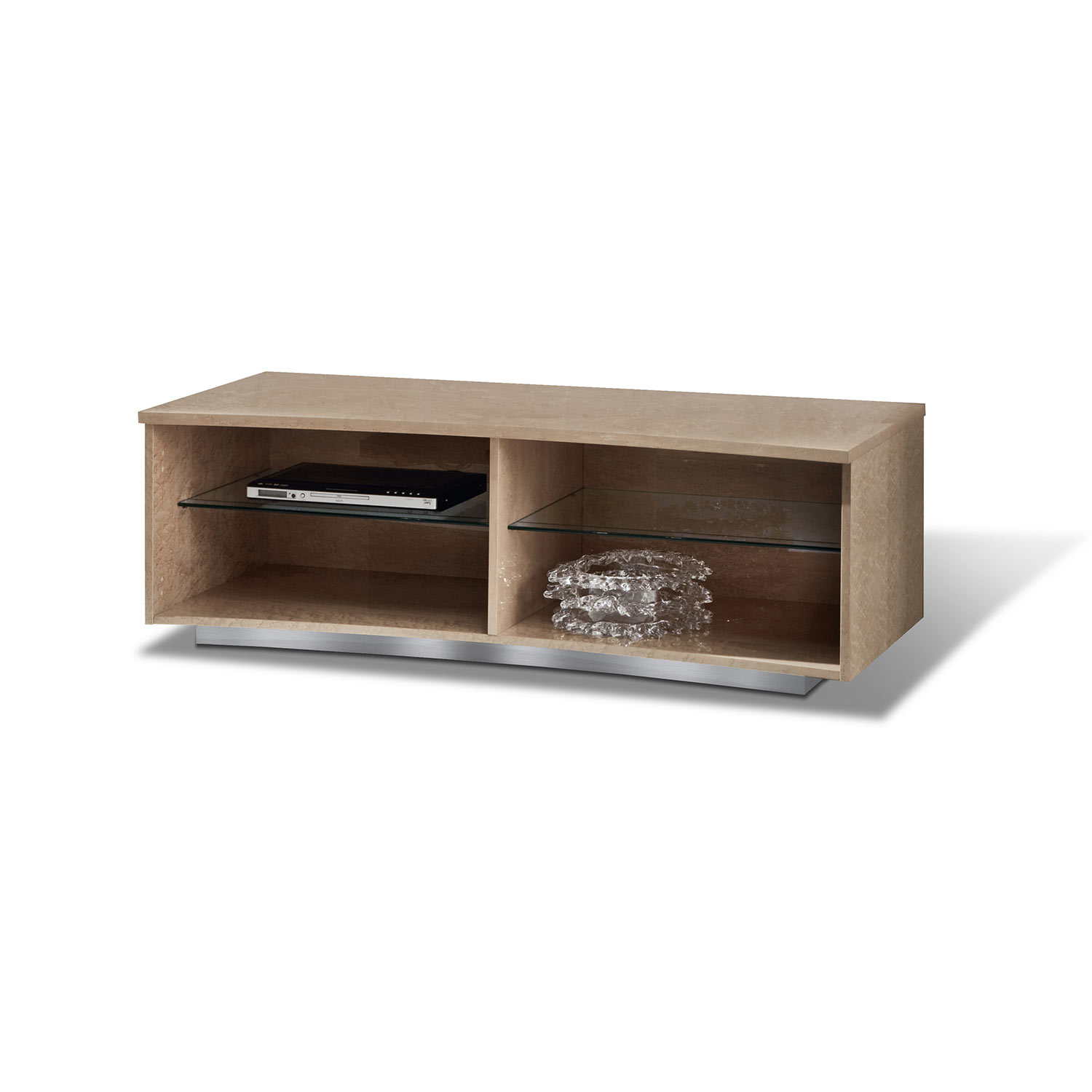 底座仅用于等离子电视,没有门。开放空间和2个可调节的玻璃搁板,采用高光聚酯香槟鸟眼枫木贴面制成。镀铬不锈钢底座。