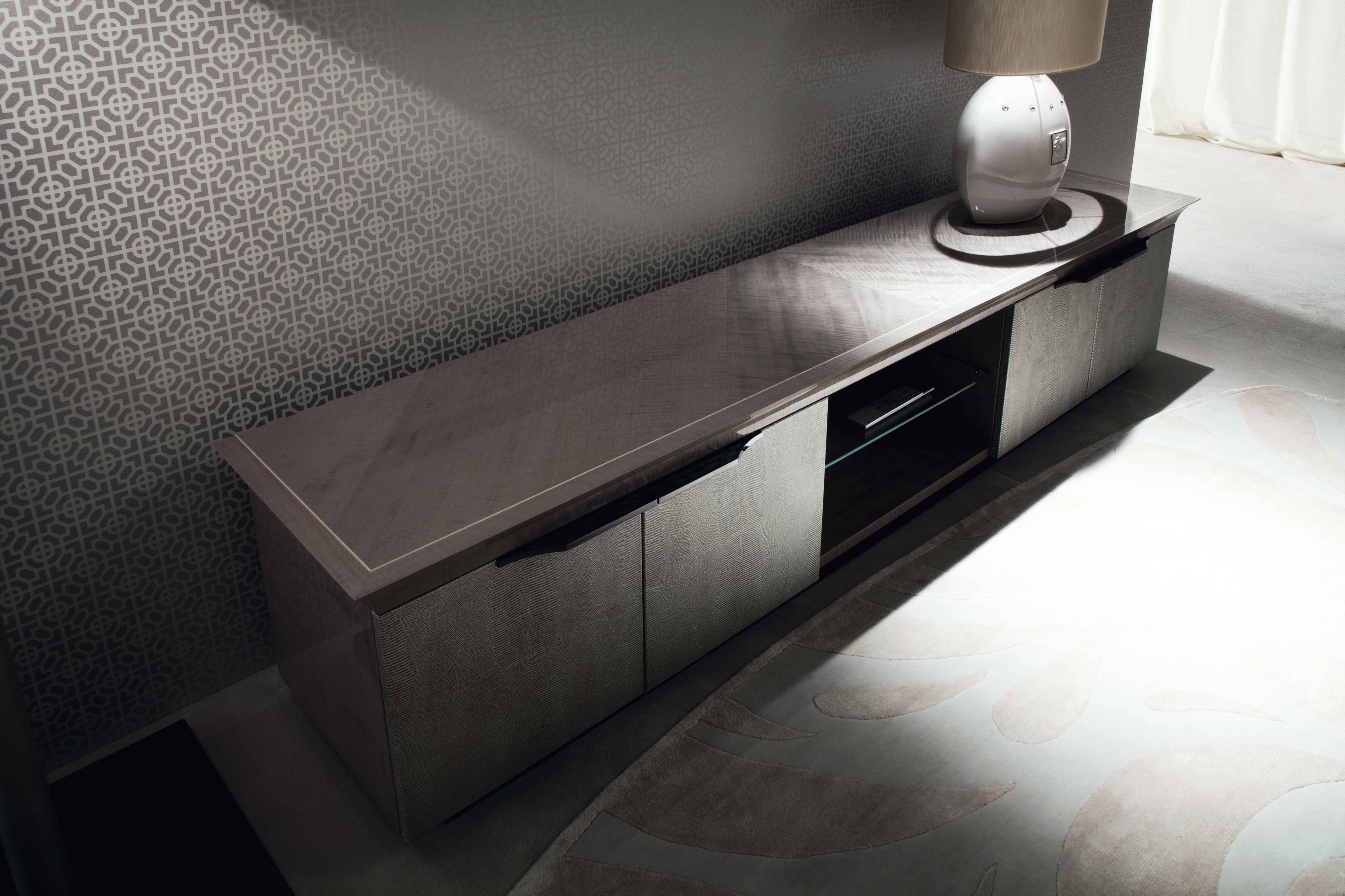 等离子电视装置的基础在老虎非洲锡科莫尔单板与高光泽聚酯完成。4扇银色蜥蜴印花皮革门和1个开放空间。1 个中央玻璃搁板和 2 个横向玻璃搁板。底座和手柄采用不锈钢制成,采用深灰色表面处理。