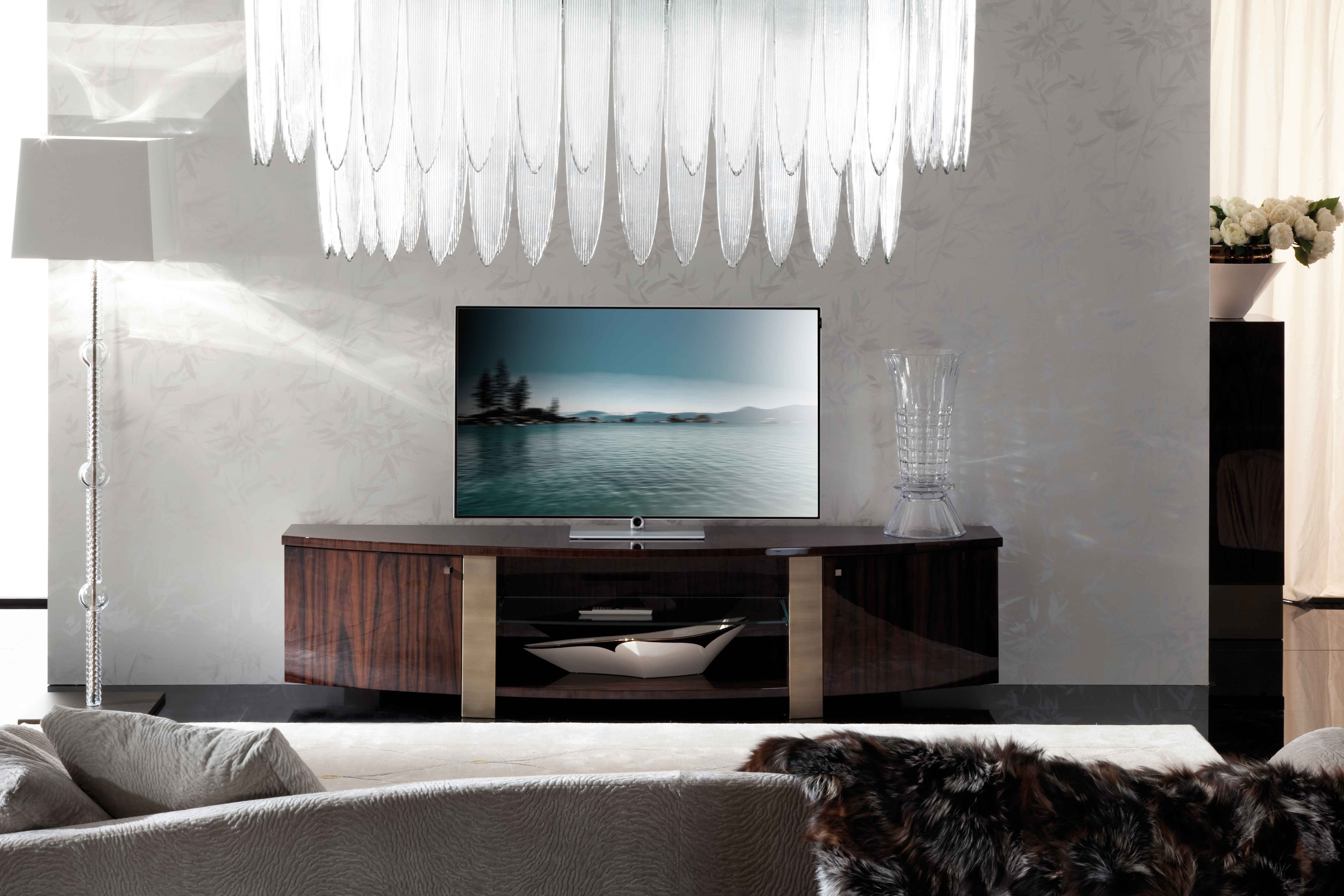 等离子电视装置的底座,巴西红木贴面,高光泽聚酯纤维。2个门和1个开放空间。1 个中央玻璃搁板和 2 个横向玻璃搁板,饰有"Giorgio 系列"插入黄铜徽标的旭日贴面顶部。底座和手柄采用古铜色不锈钢制成。