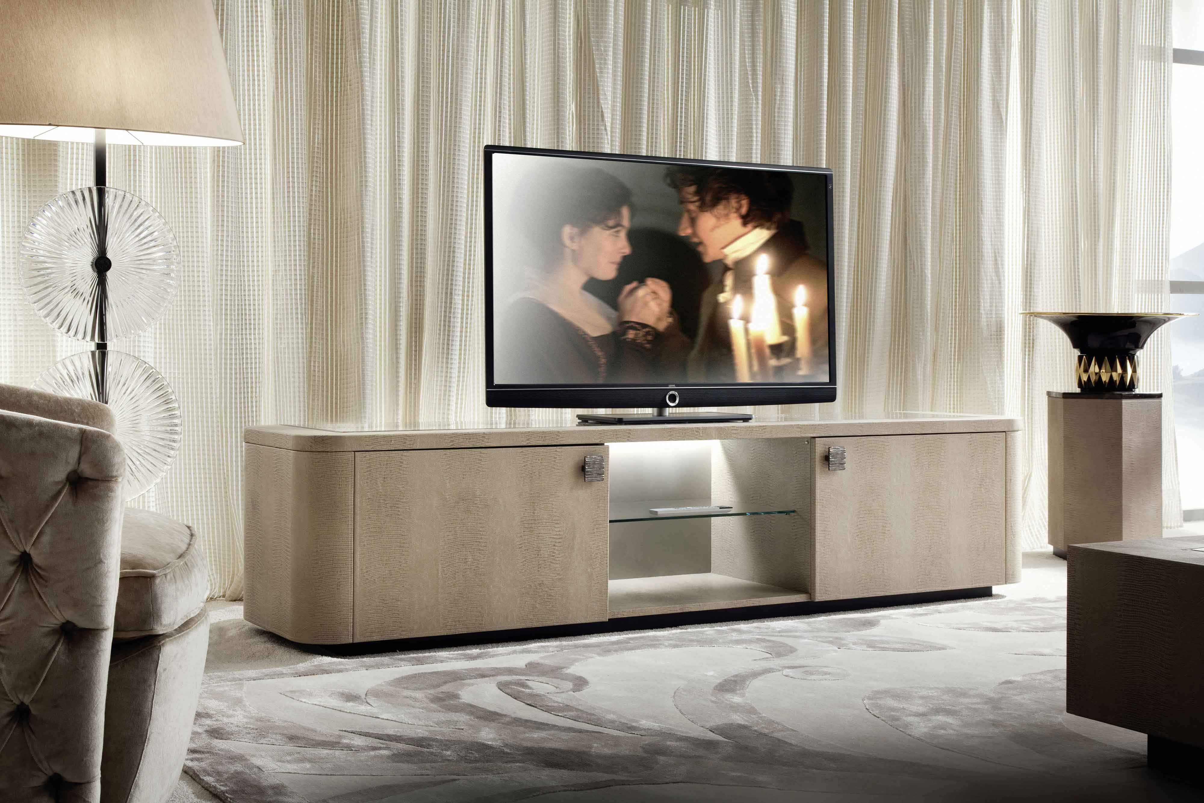 等离子电视装置底座,犰狳印花皮革,棕色emperador大理石顶部嵌件。2个门和1个带玻璃架子的开放空间,带LED灯。底座、细节和手柄采用青铜黄铜制成