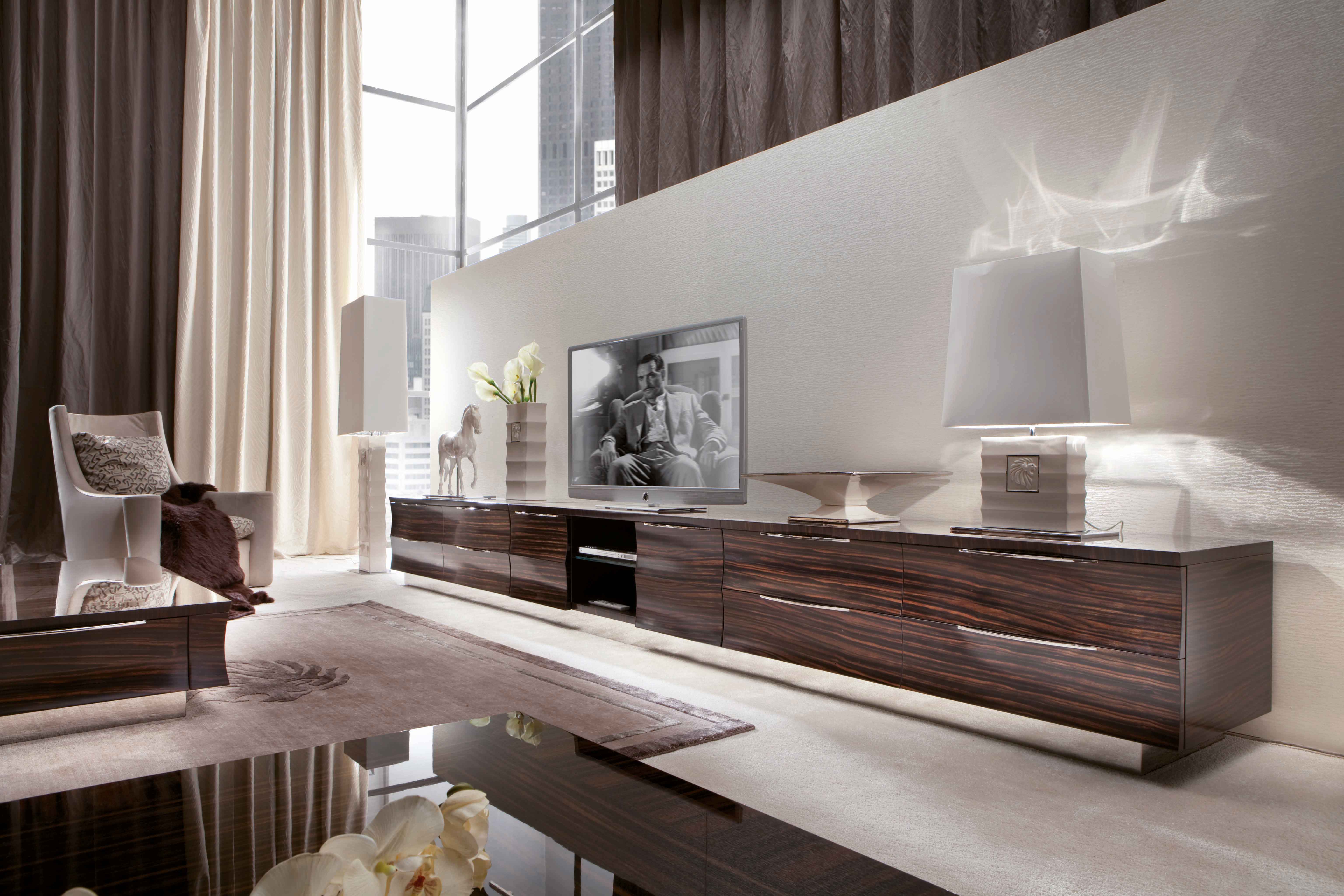 等离子电视单元乌木贴面的底座,缎面饰面。4个全延伸抽屉,底部采用天鹅绒织物,1个中心开放空间,带玻璃架,带LED灯。镶嵌上衣采用乌木贴面。镀铬不锈钢底座和手柄。