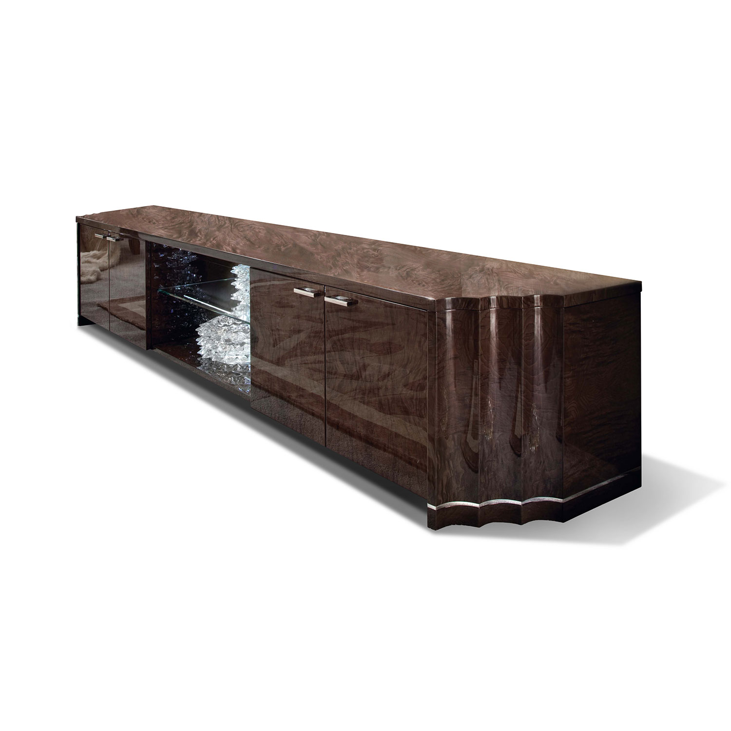 用于 T.V. 单位在摩卡日本 tamos burl 贴面在高光泽聚酯。4门和1个带玻璃架的开放空间,带LED灯。底座和手柄采用镀铬不锈钢制成。
