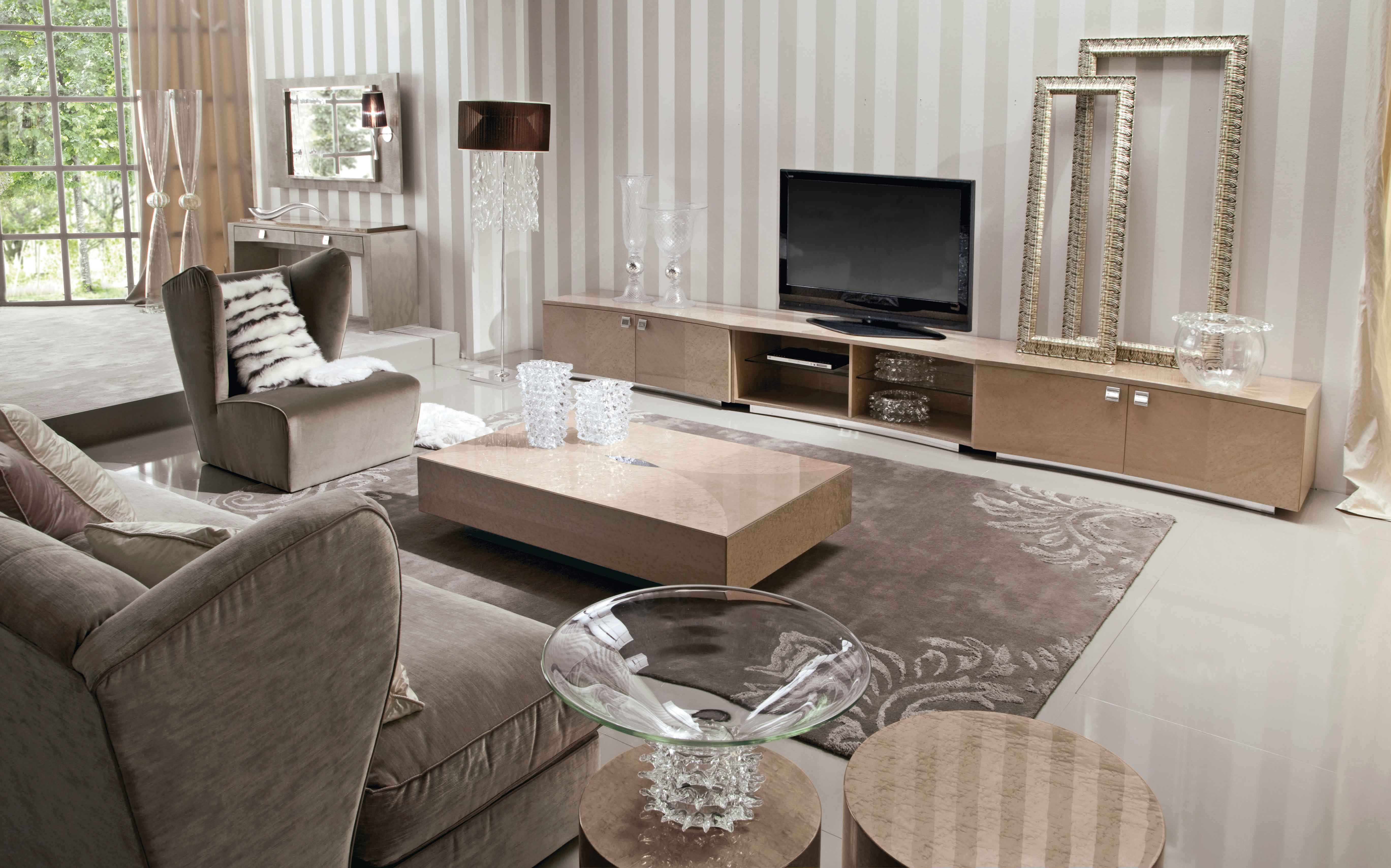 底座仅用于电视,带有2个木门,采用高光聚酯香槟鸟眼枫木贴面制成。2个可调节的内部玻璃搁板。镀铬不锈钢底座和手柄。