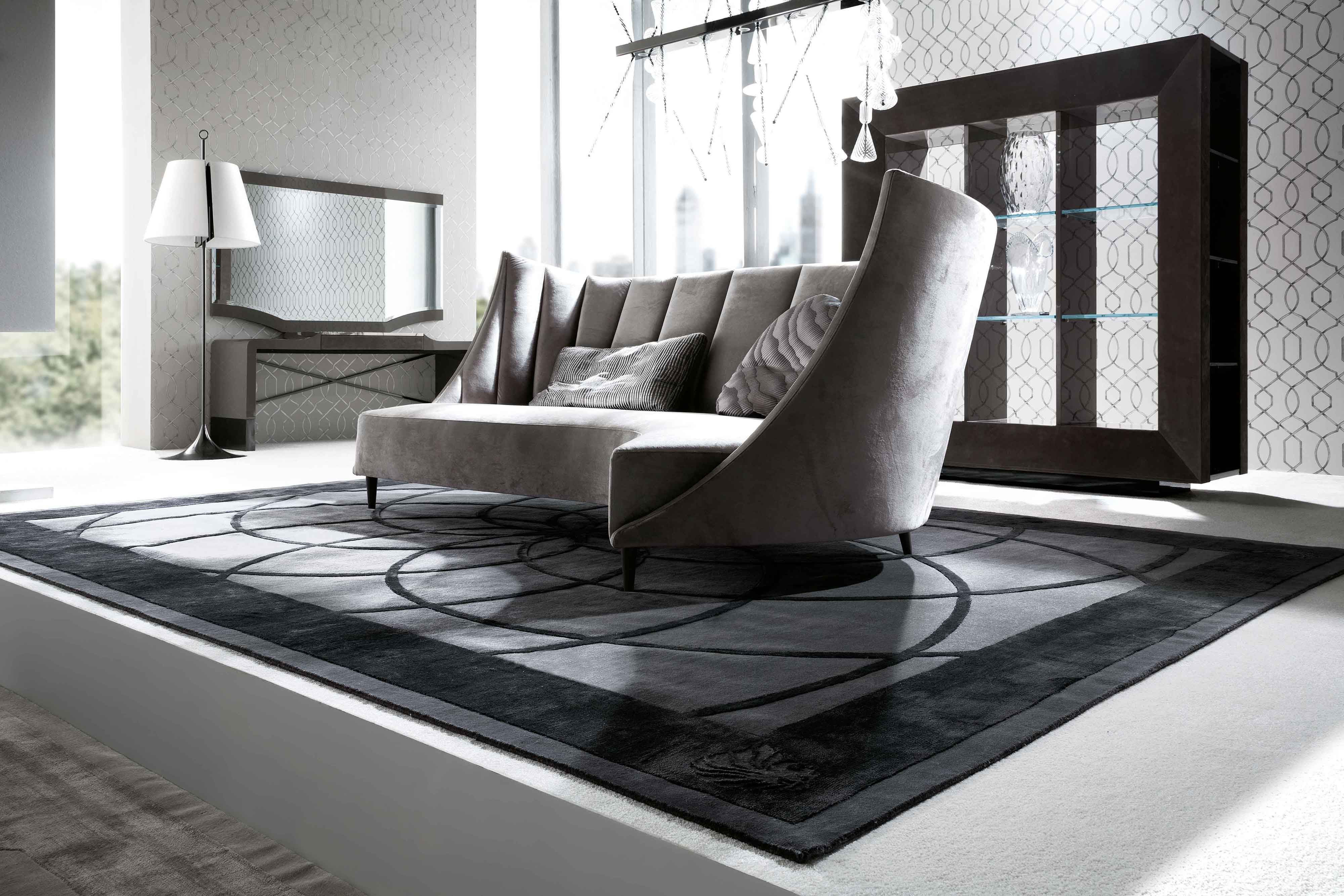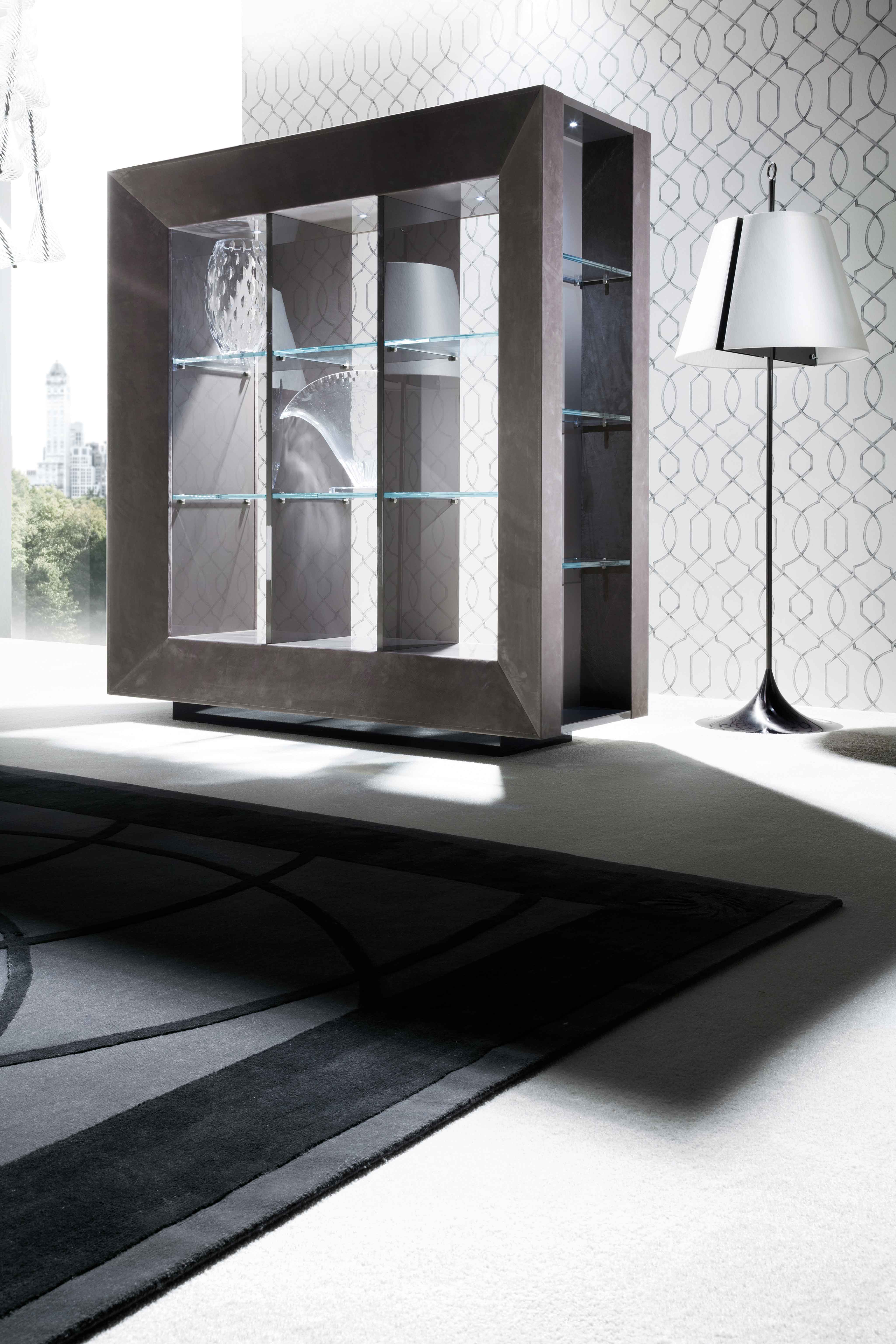 双面展示柜,天然努布克皮革,内侧玻璃搁板。侧板采用高光聚酯灰色漆面。中心带 6 个玻璃搁板/侧部,每个搁板 3 个玻璃搁板。5 个卤素 LED 灯