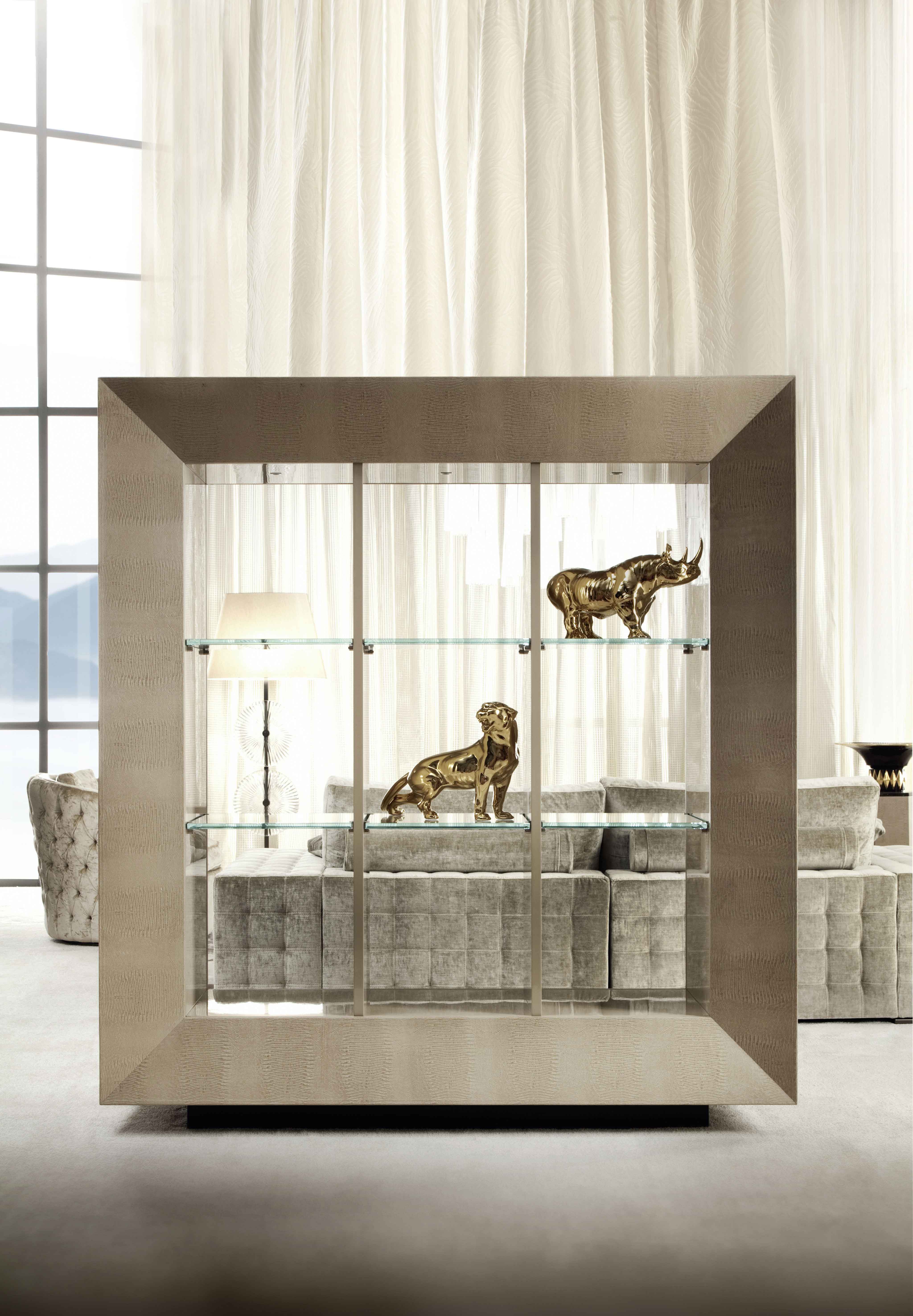 双面展示柜采用犰狳印花皮革制成,内搁板采用高光聚酯漆。侧板,带3个高光聚酯漆搁板。2 个卤素 LED 灯,包括开关。