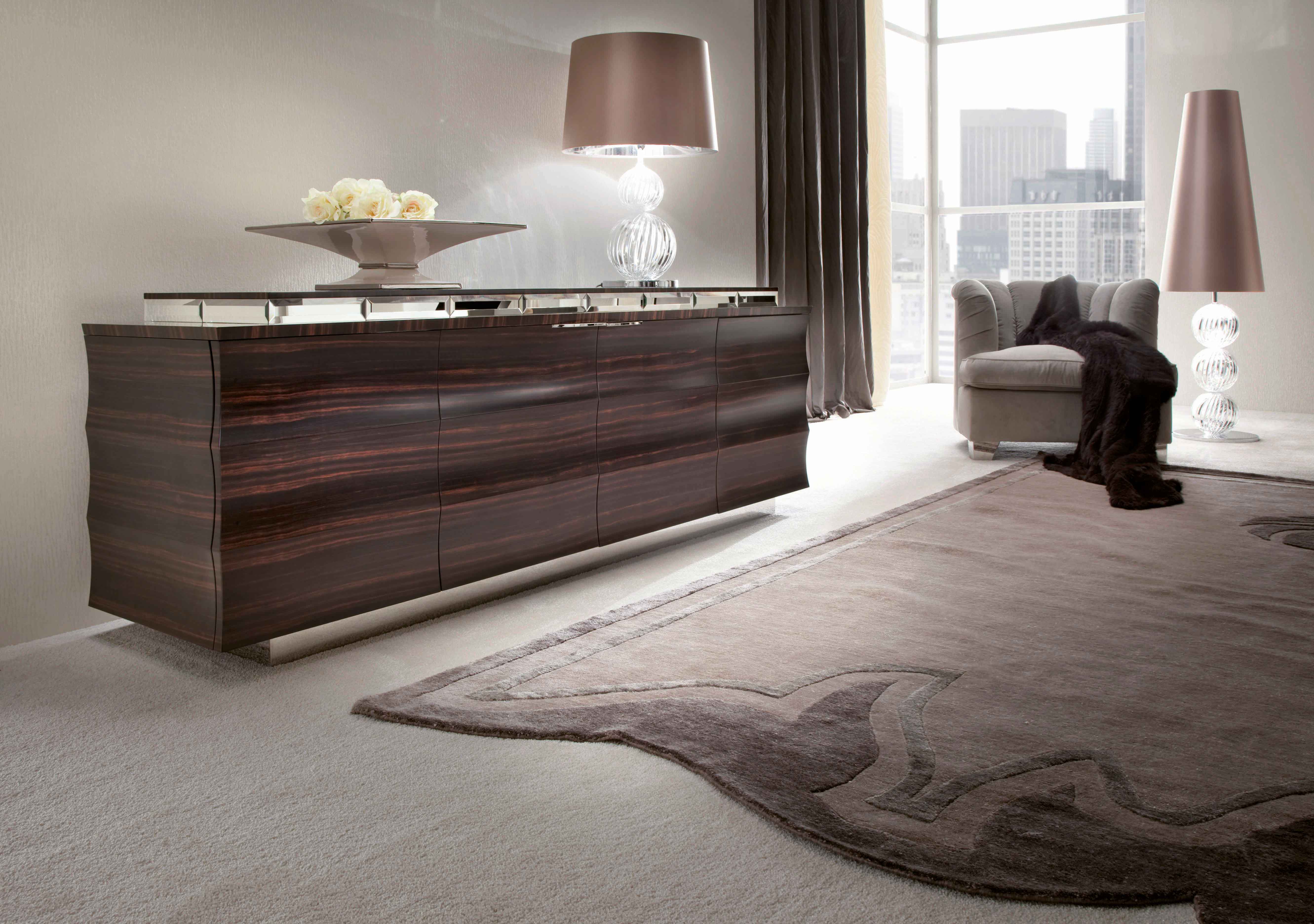 4门自助餐在望加锡乌木贴面在缎面完成。LED灯系统,带传感器,位于2个中心门中。顶部,斜面镜边缘带嵌件,镀铬不锈钢顶部镶嵌。