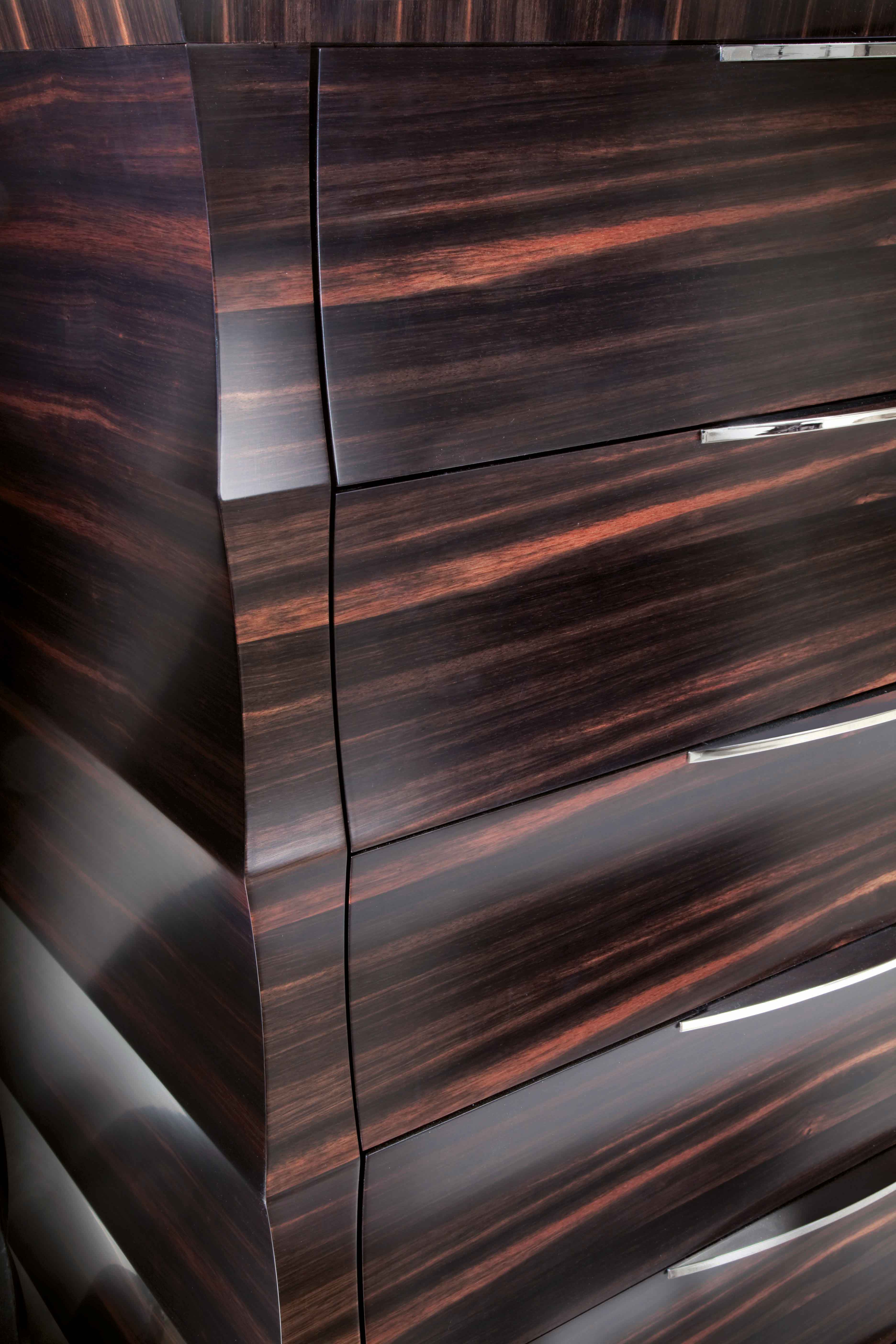 胸部在望加锡乌木贴面在缎面妆感。6个全延伸抽屉,2个顶部抽屉,底部为天鹅绒织物。镀铬不锈钢顶部镶嵌。镀铬不锈钢手柄和细节。