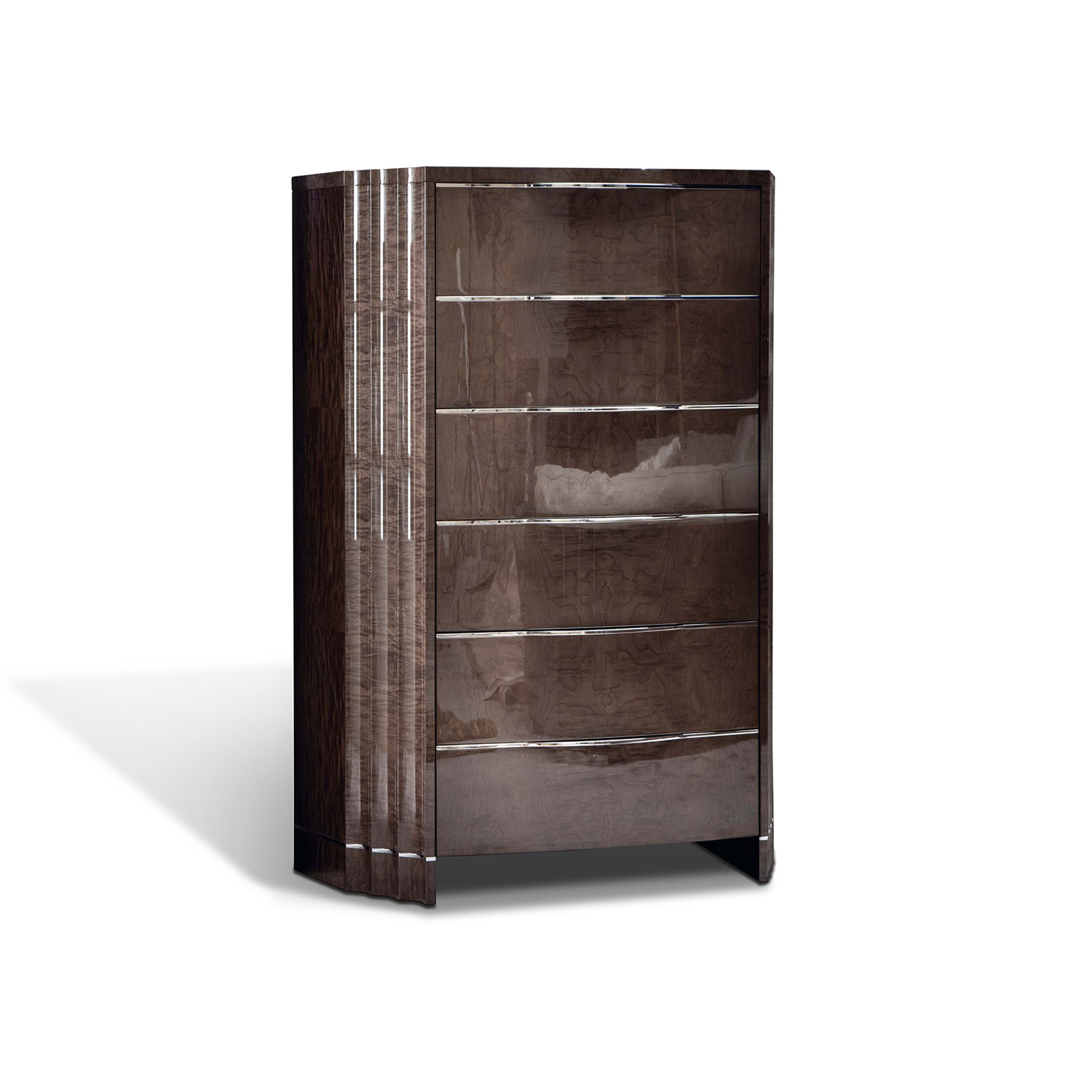 胸部在摩卡日本塔莫斯伯尔贴面 w/高光聚酯妆感。6个全延伸抽屉,2个顶部抽屉,底部为天鹅绒织物。镀铬不锈钢手柄和底座。