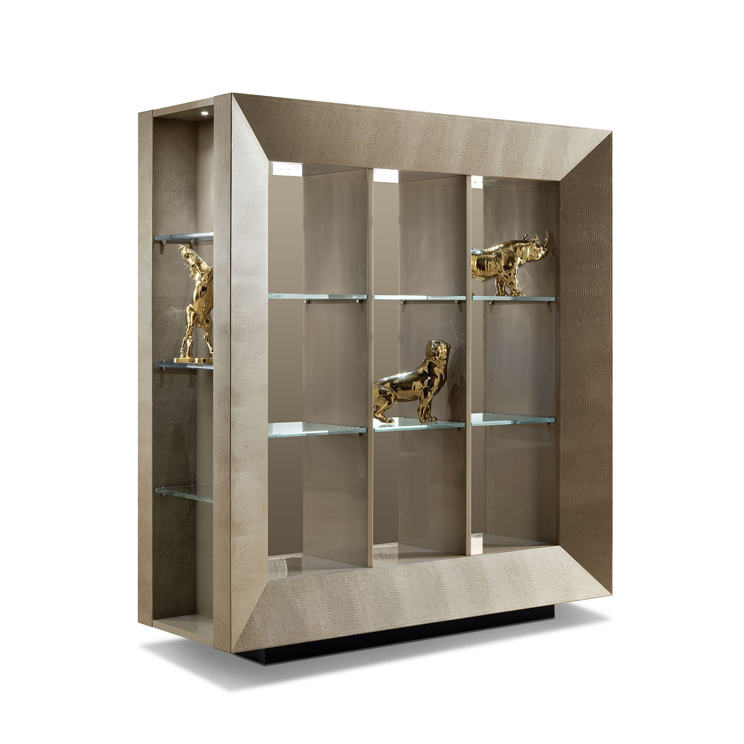展示柜采用犰狳印花皮革制成,内搁板采用高光聚酯漆。侧板,带3个高光聚酯漆搁板。2 个卤素 LED 灯,包括开关。