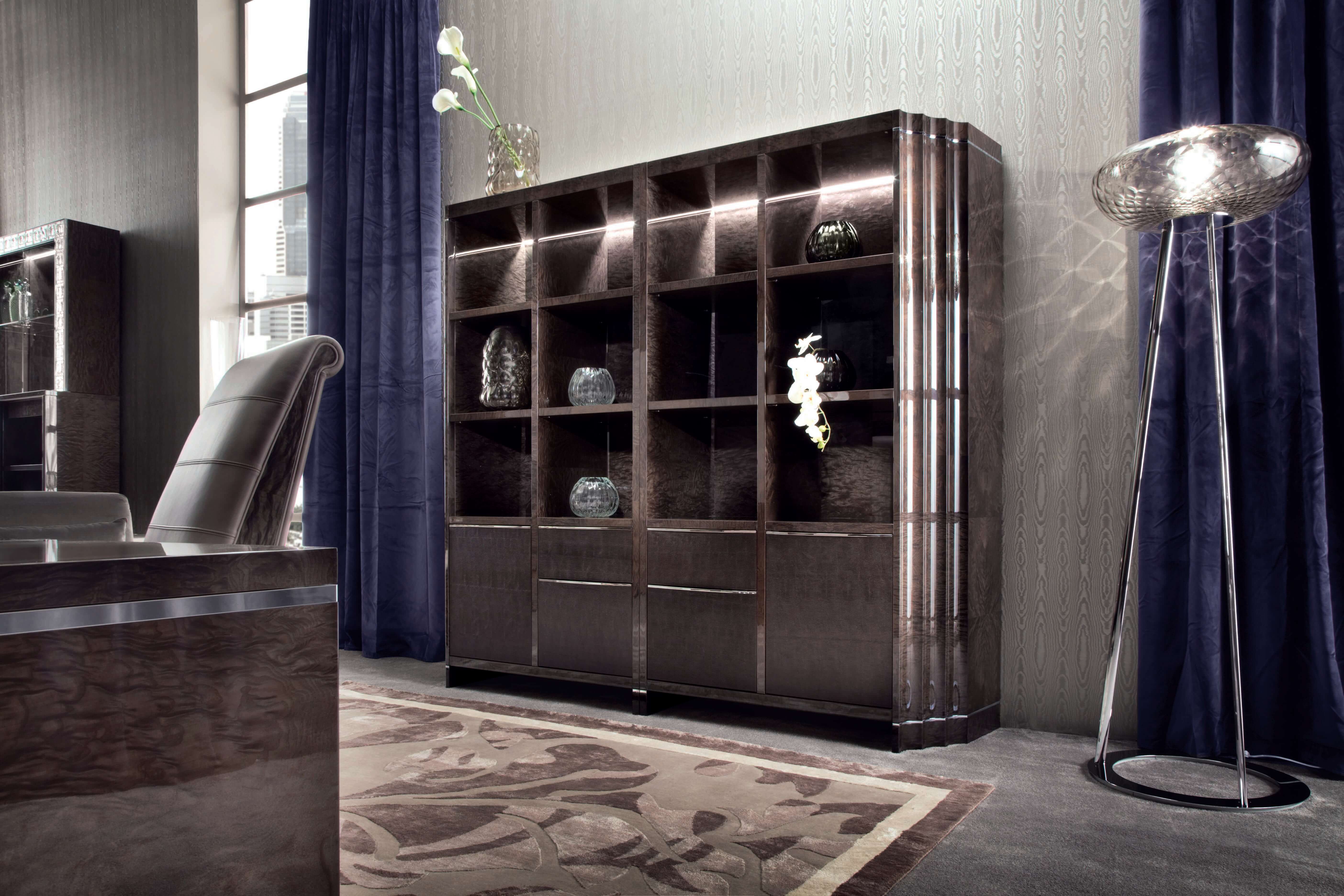 双书柜在摩卡日本塔莫斯毛刺单板在高光泽聚酯完成。8个木制搁板和特殊的LED灯系统,包括触摸开关。2 个门、2 个小抽屉和 2 个文件抽屉,上面覆盖着"Moresco"皮革。