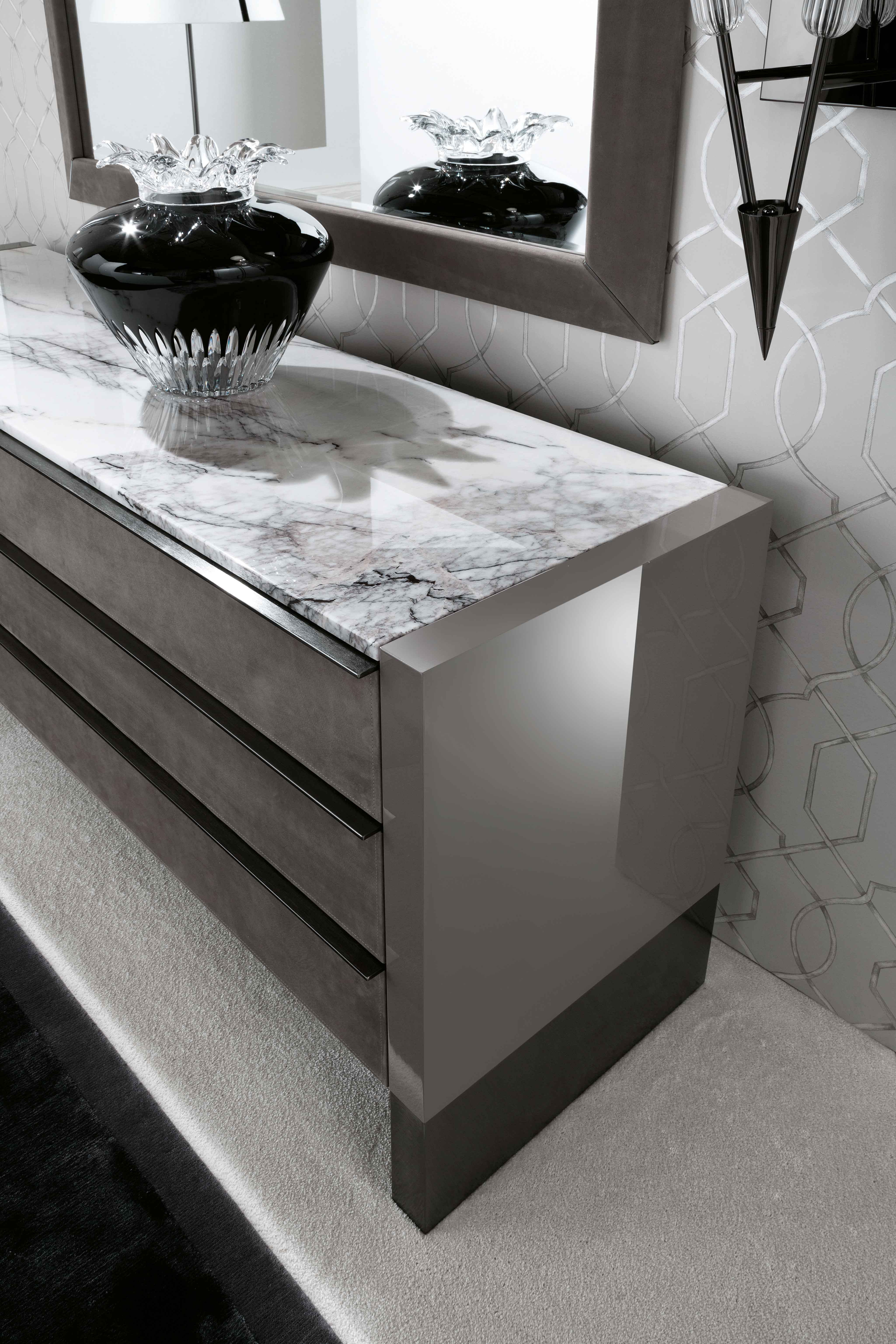 高光聚酯灰色漆梳妆台,大理石顶部。3个全延伸双抽屉,正面采用天然保护的nubuk皮革,底部采用天鹅绒面料。底座、支腿和手柄采用黑色镍钢制成。