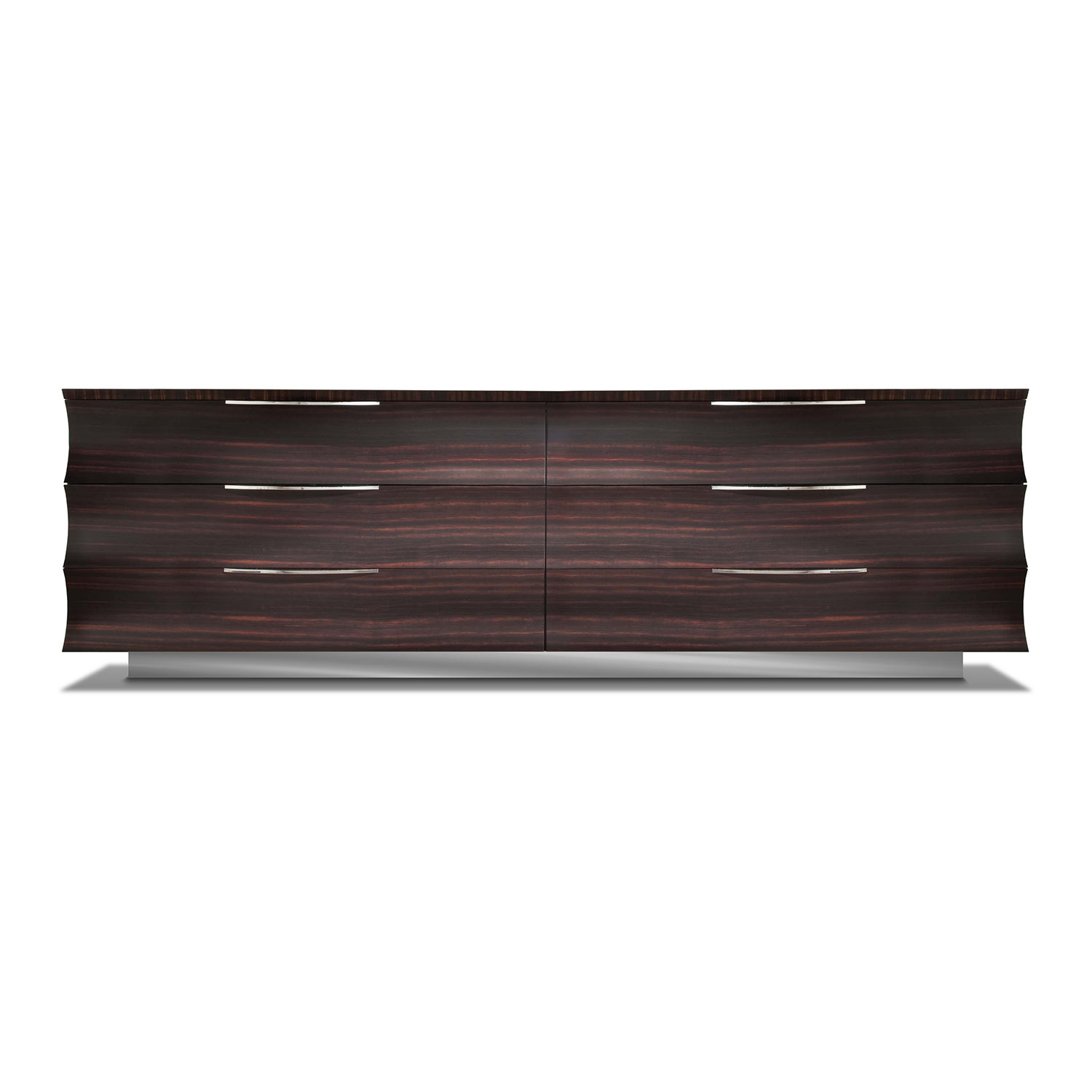梳妆台在望加锡乌木贴面在缎面妆感。6个全延伸双抽屉,底部顶部抽屉采用天鹅绒面料制成。镀铬不锈钢顶部镶嵌。镀铬不锈钢手柄和底座。