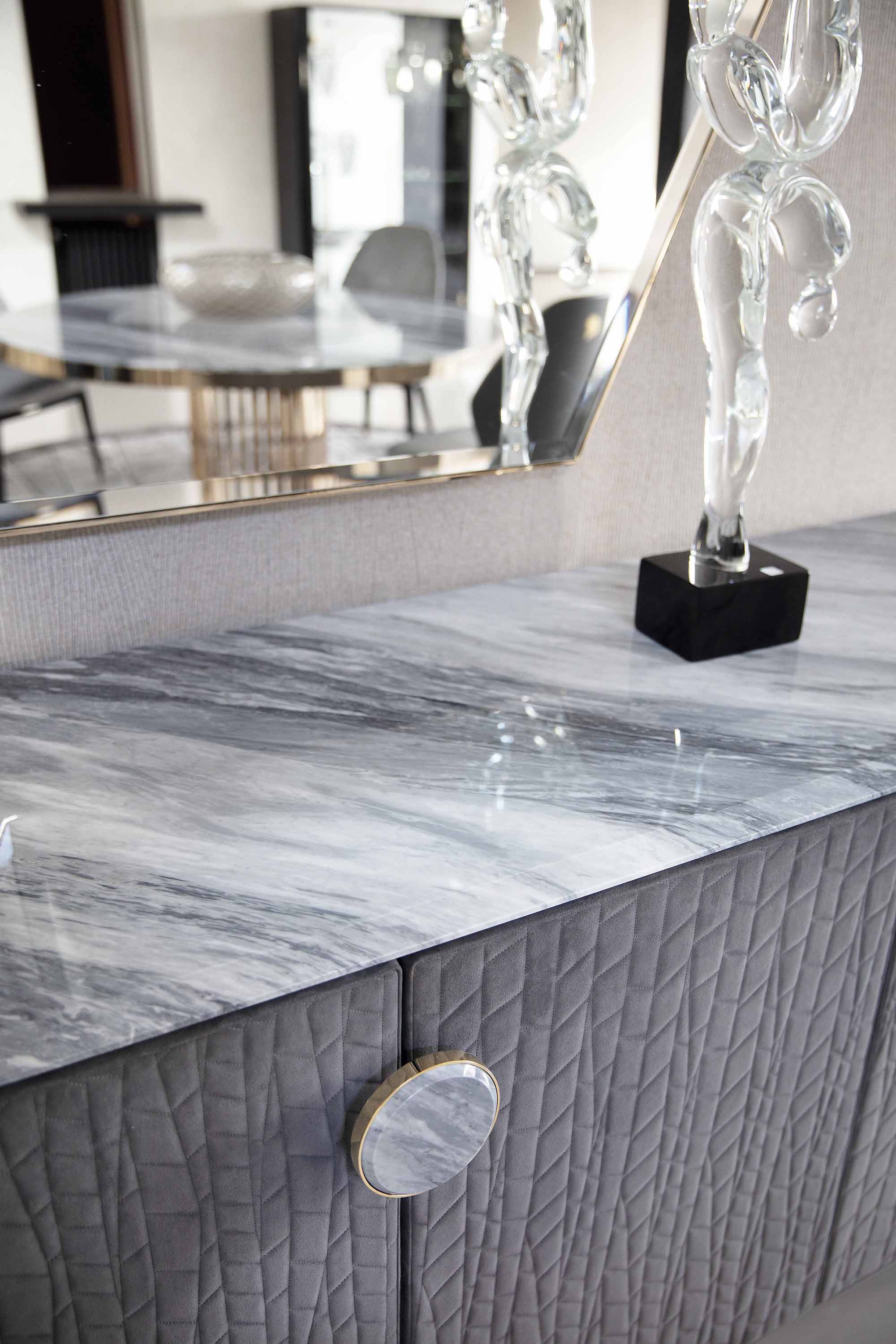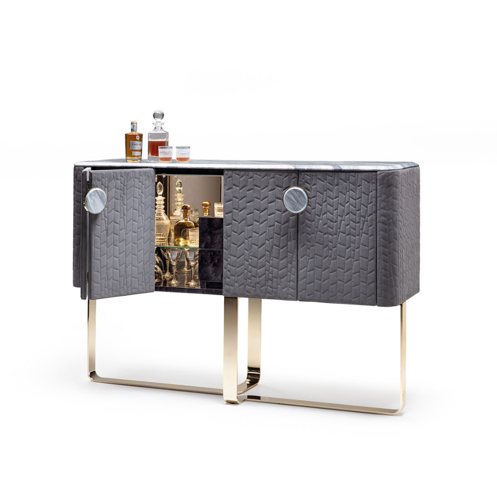 客厅酒吧采用绗缝灰色努布克色6号。2个双推拉门,带2个大把手,由斜面大理石和浅金铬不锈钢组合而成。顶部采用斜面大理石。