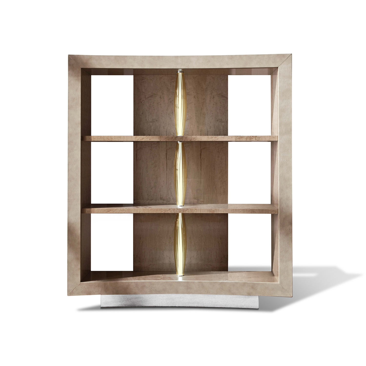 开放式展示柜采用香槟色鸟瞰枫木和印花鬣蜥皮革制成。威尼斯"穆拉诺"玻璃嵌件,带LED灯系统,包括开关。镀铬不锈钢底座。