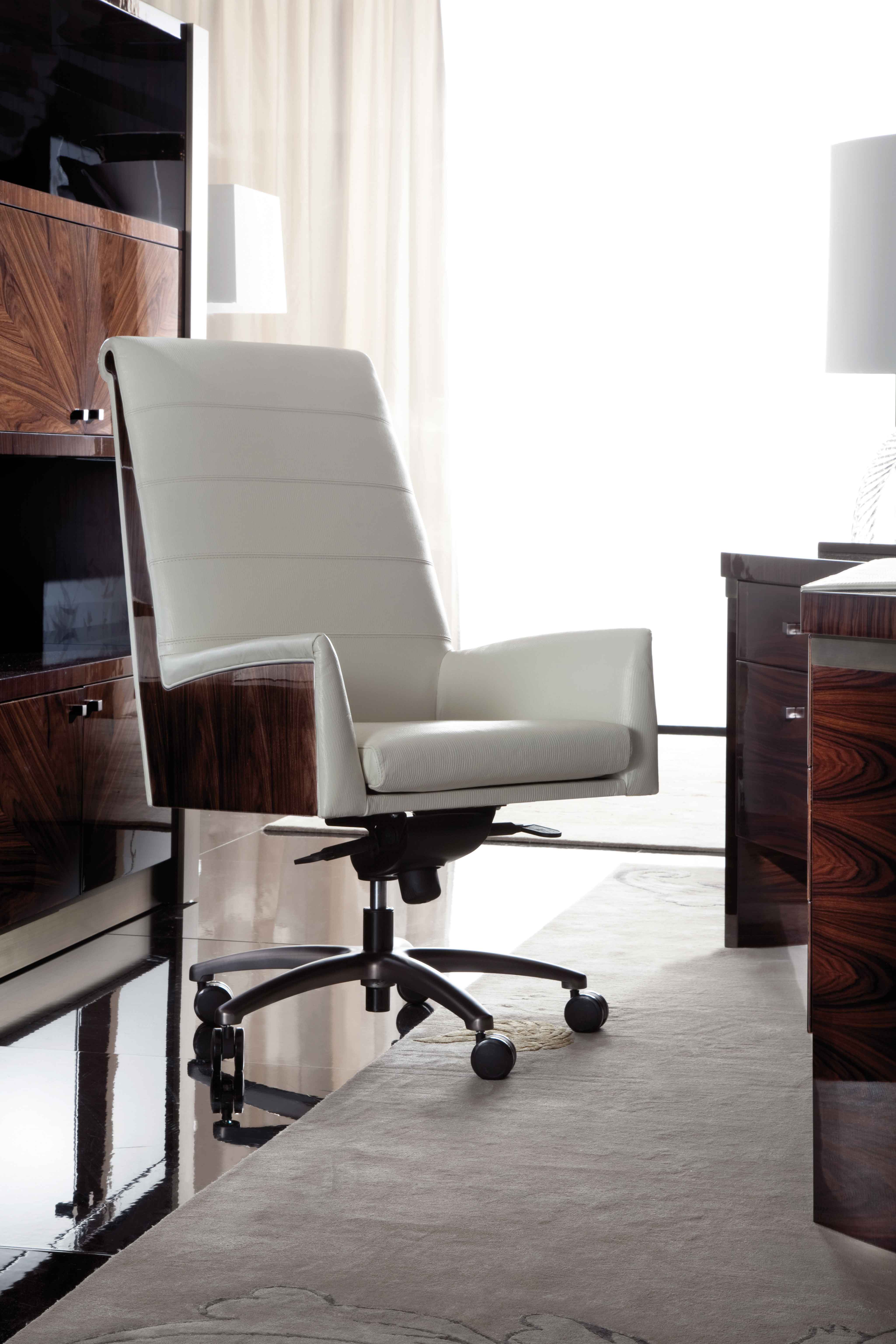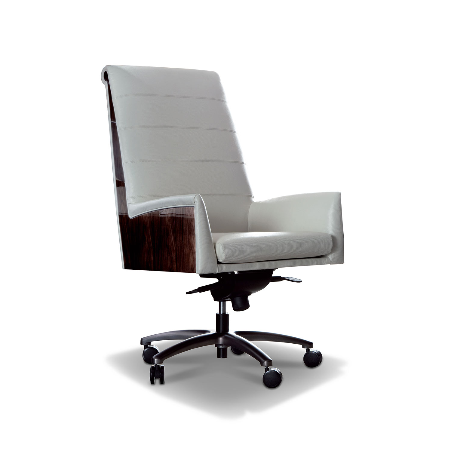 总统办公椅,皮革,nubuk皮革,绒面革面料,轮子高度可调。侧板采用巴西红木贴面,高光聚酯纤维。底座采用古铜色不锈钢制成。