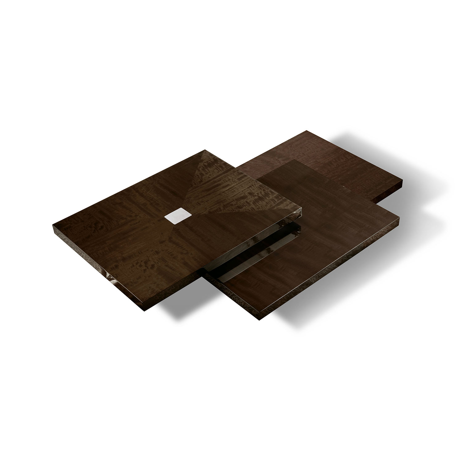 鸡尾酒桌,3个不同的顶级欧洲卷曲桉树贴面,高光泽聚酯纤维。顶部最高,中心带不锈钢嵌件。