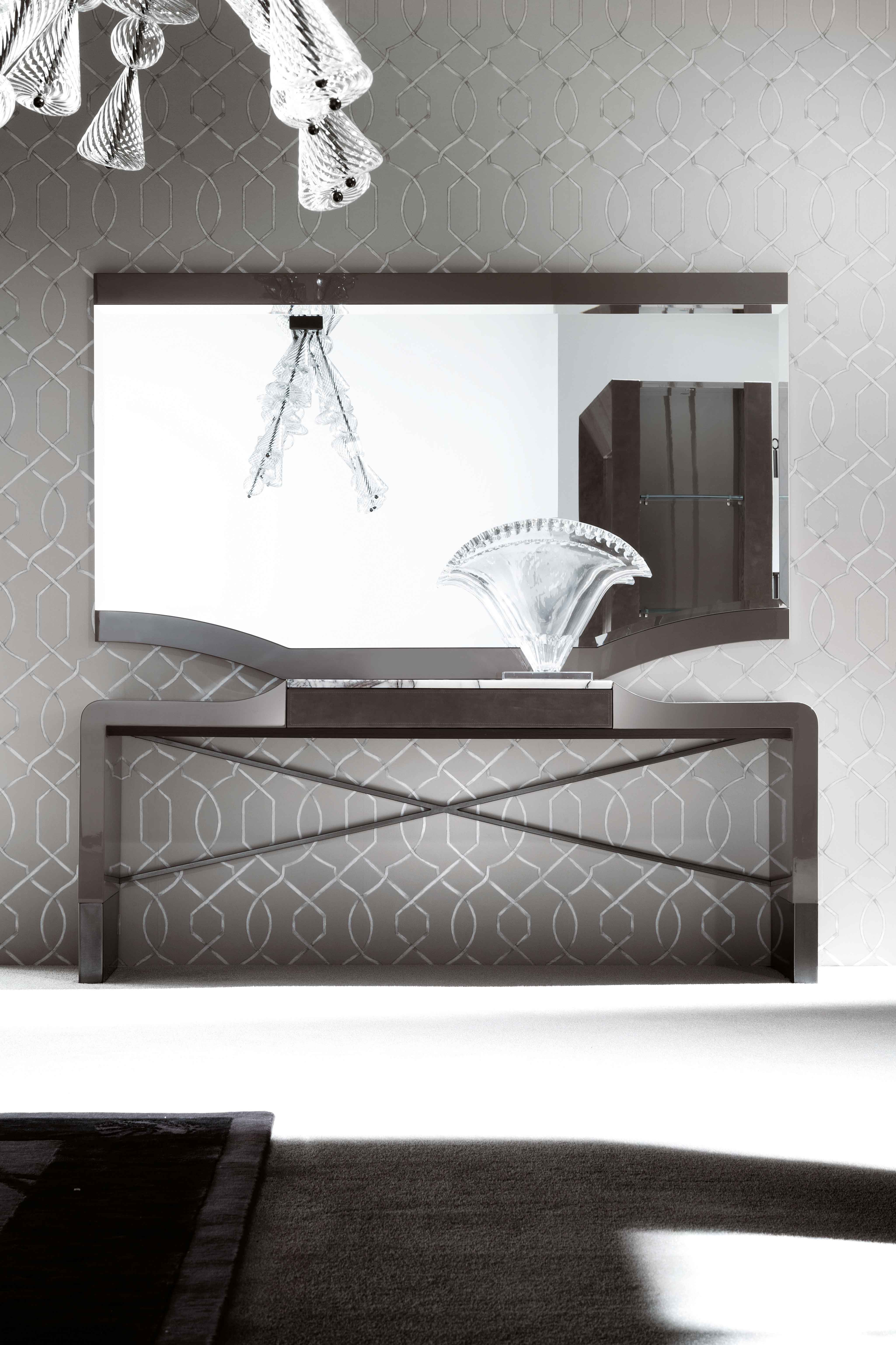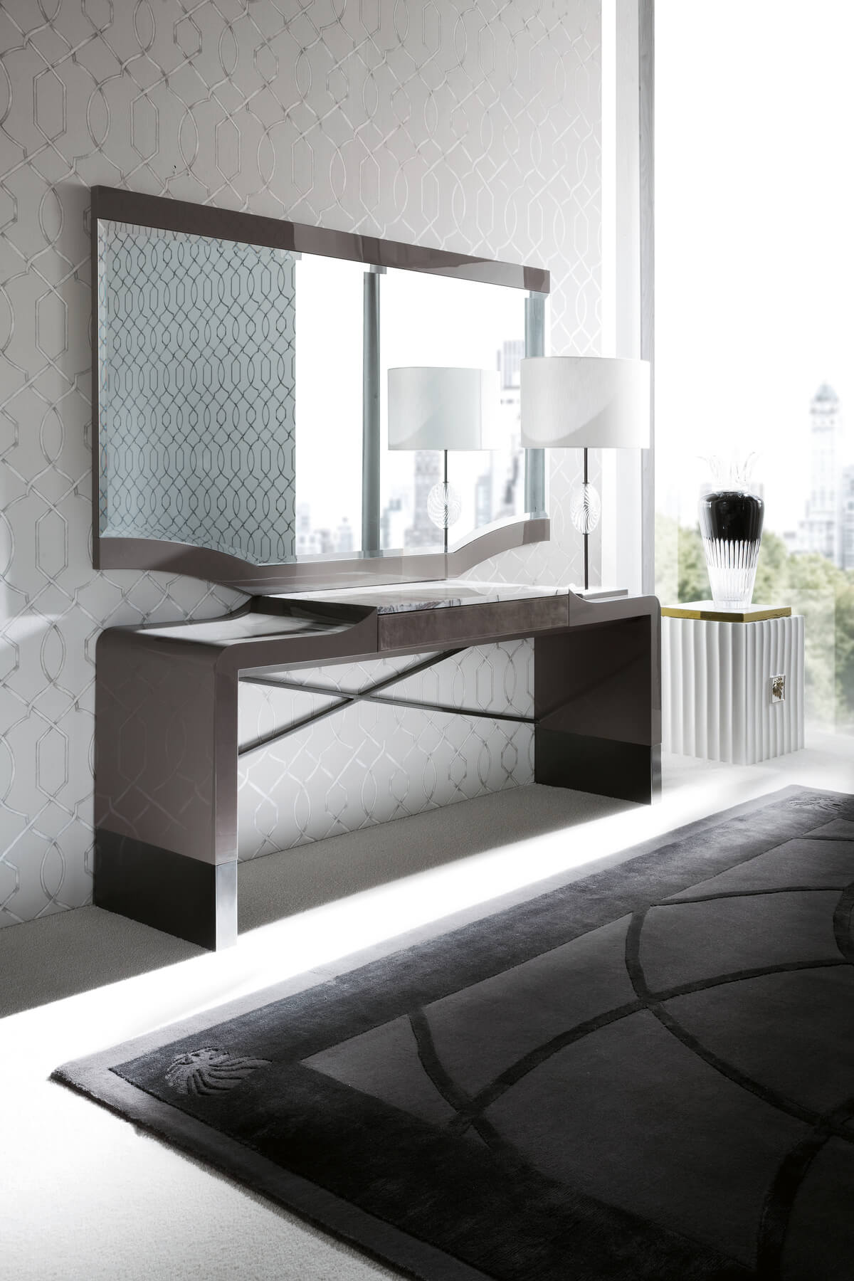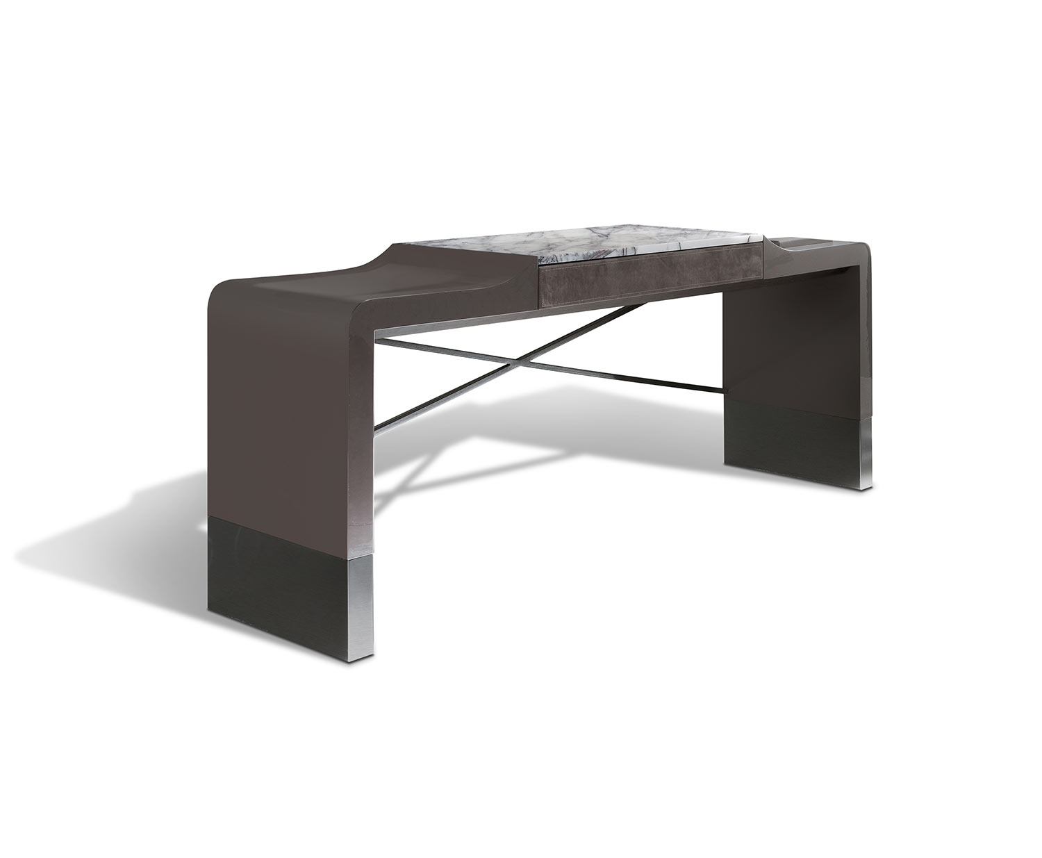 高光聚酯灰色漆面控制台,顶部为大理石。底座和细节采用黑色镍钢制成。1 个全延伸抽屉。