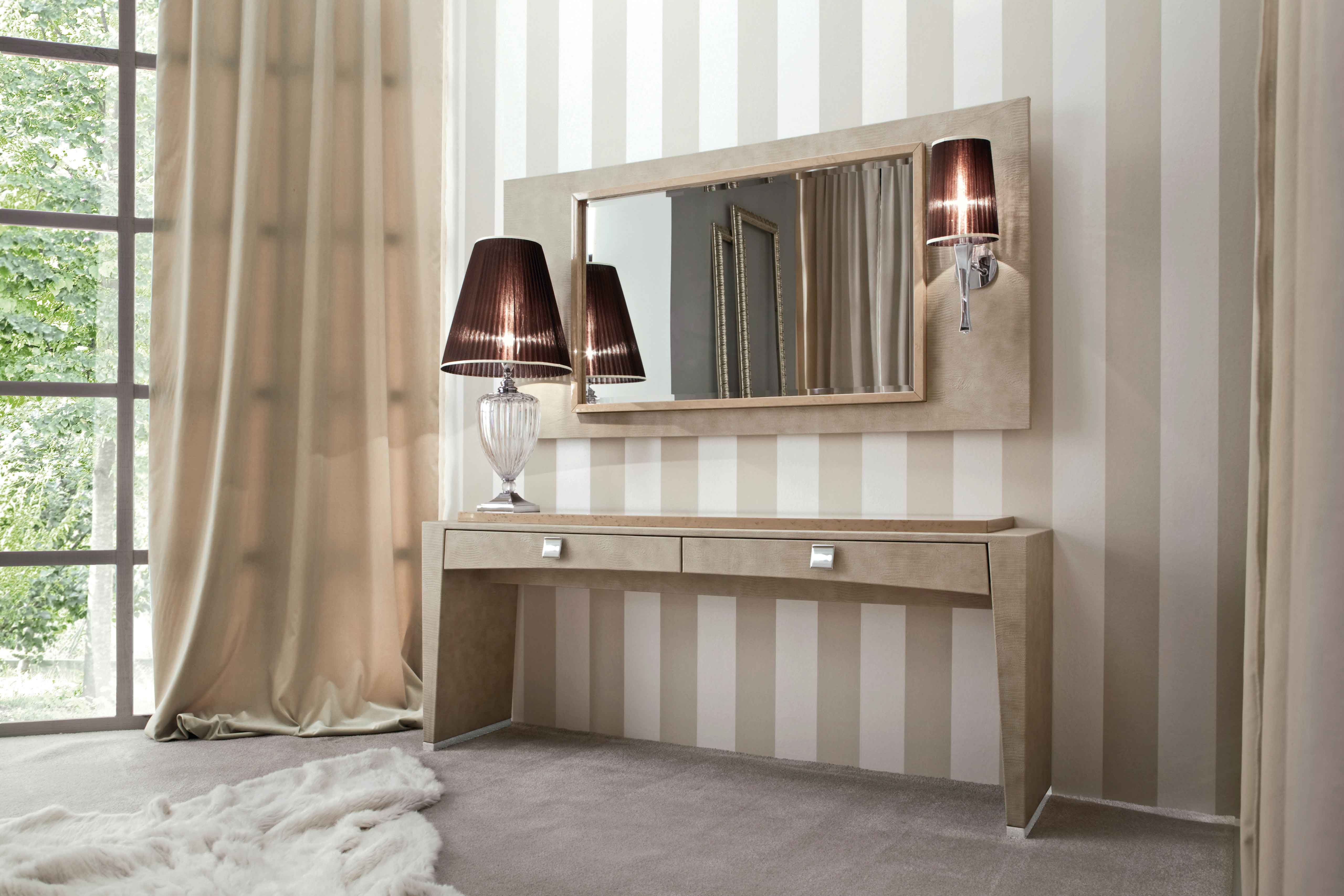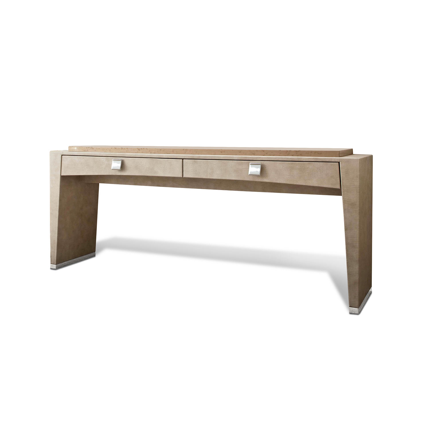 控制台采用香槟色鸟瞰枫木贴面和印花鬣蜥皮革。顶部在鸟眼枫木贴面在高光泽聚酯妆感。铬不锈钢底座。