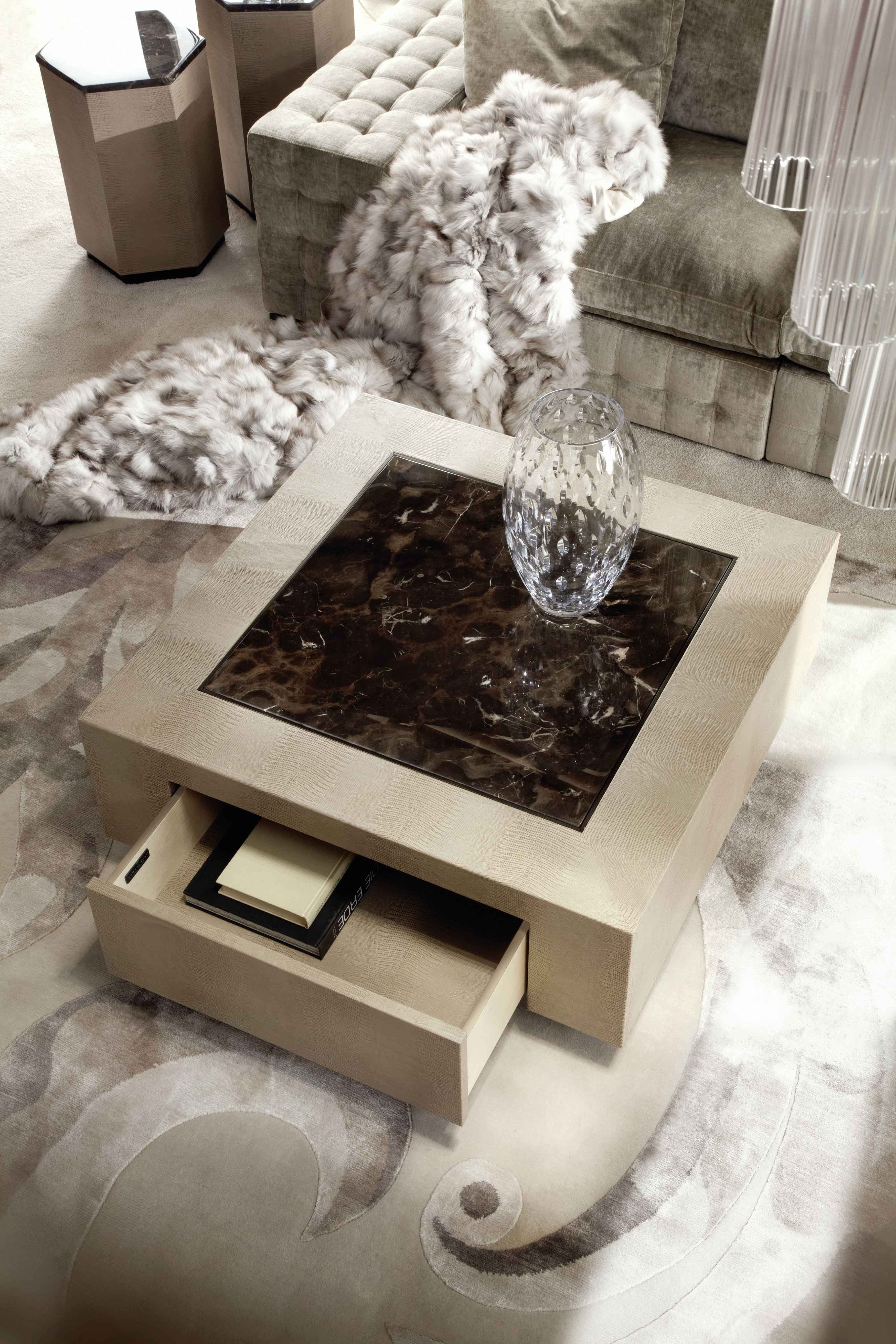 方形鸡尾酒桌采用犰狳印花皮革制成,深色大理石台面。1个全延伸抽屉,底部采用犰狳印花皮革制成。