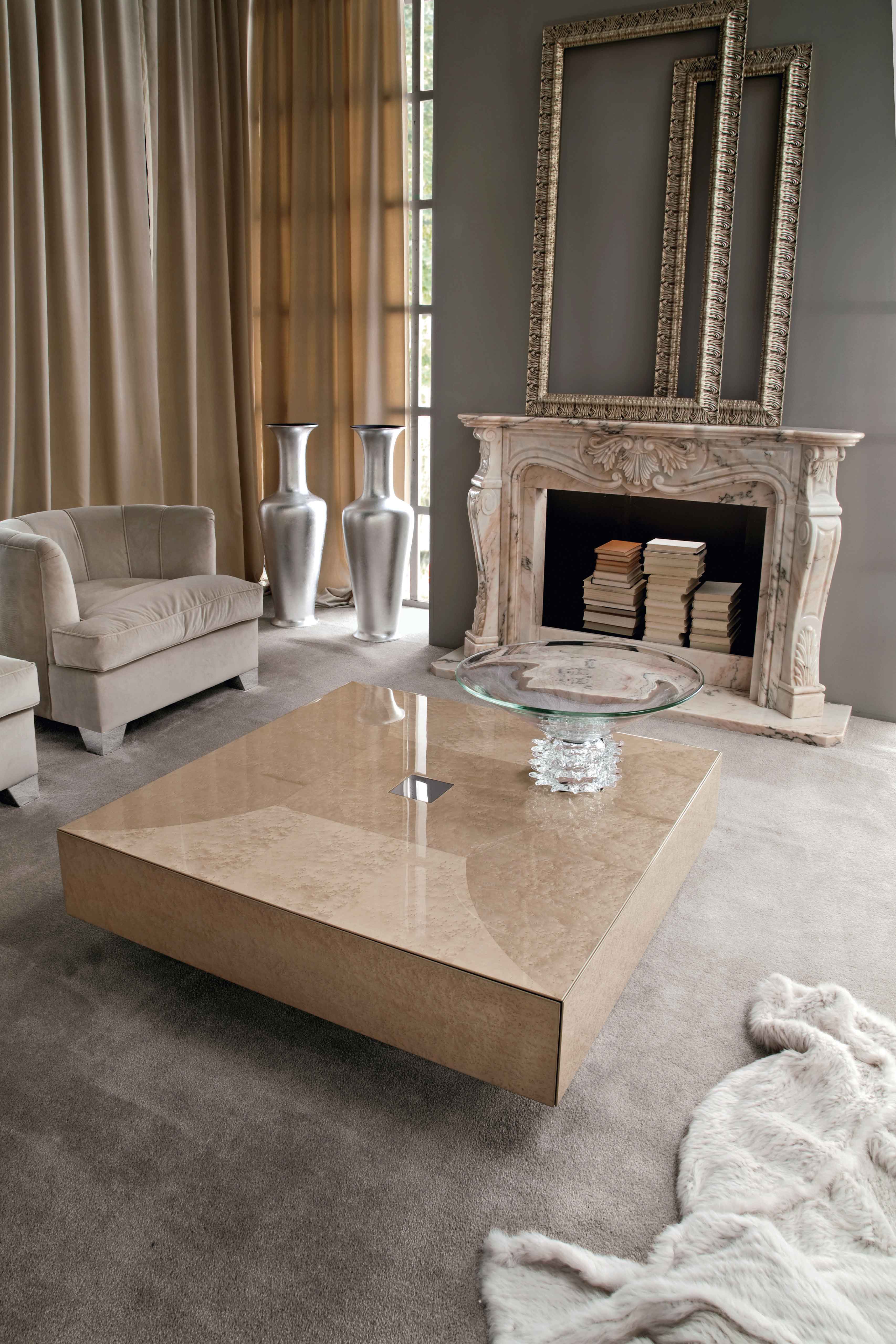 方形鸡尾酒桌,香槟鸟瞰枫木贴面。不锈钢镶嵌的顶部嵌件。高光聚酯饰面。2 个全延伸抽屉。不锈钢底座。