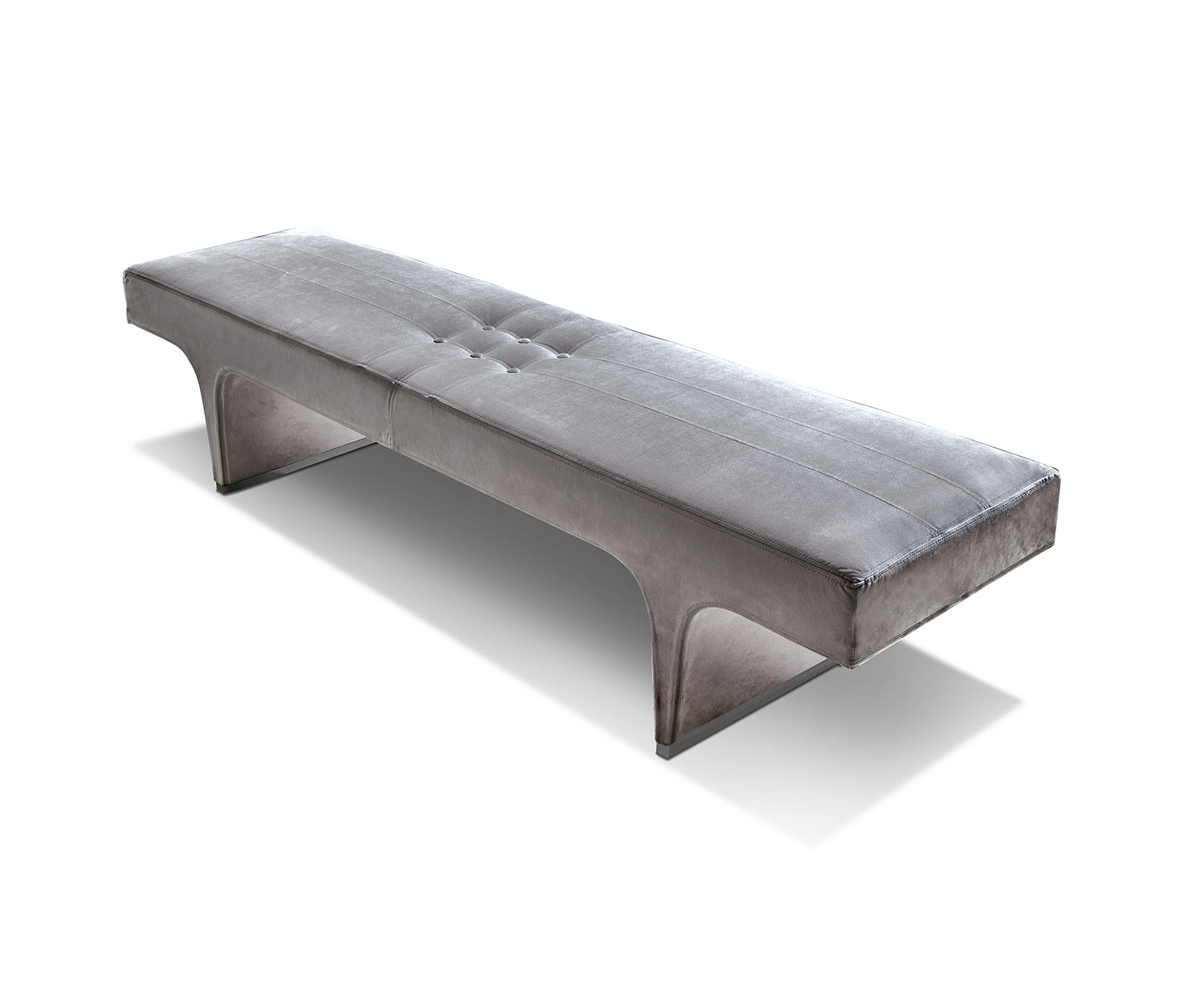 软垫长凳有蜥蜴印花皮革,一级皮革,纳布克皮革,天鹅绒,天鹅绒或绒面革面料可供选择。底座由暴风雨深灰色饰面不锈钢制成,白色枫木细线镶嵌。
