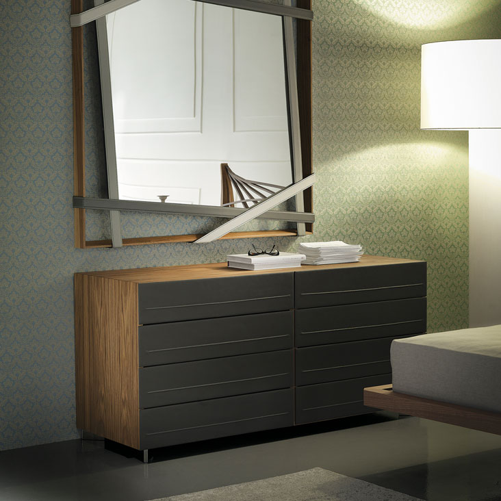 带 2 个抽屉的床头柜或带 8 个抽屉的梳妆台,框架为牡蛎 (GF50) 或石墨 (GF69) 压花漆木、卡纳莱托胡桃木 (NC) 或烧焦的橡木 (RB)。抛光不锈钢脚。抽屉正面覆盖合成皮革或软皮革,根据样品卡。
