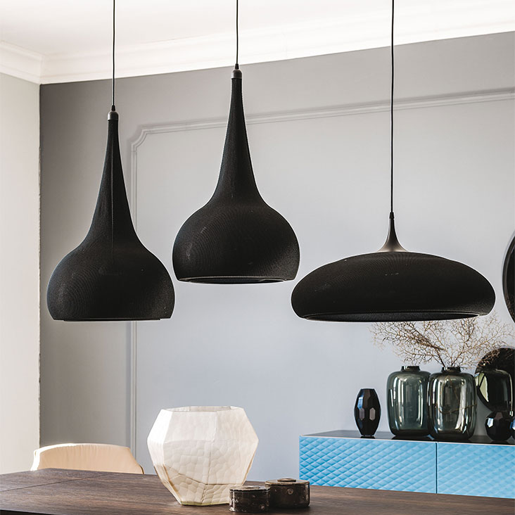 带有烟灰色甲基丙烯酸酯框架的吸顶灯。灯罩采用灰、烟、石墨、黑色或蓝色弹力针织面料制成。不包括灯泡。