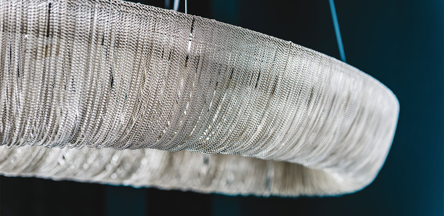 与缎镍钢框架的吸顶灯。灯罩由镀镍铝链制成。包括灯泡。