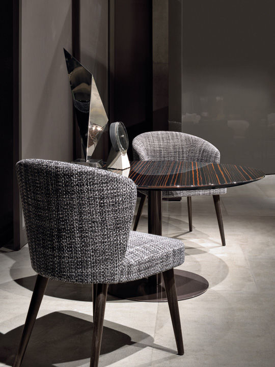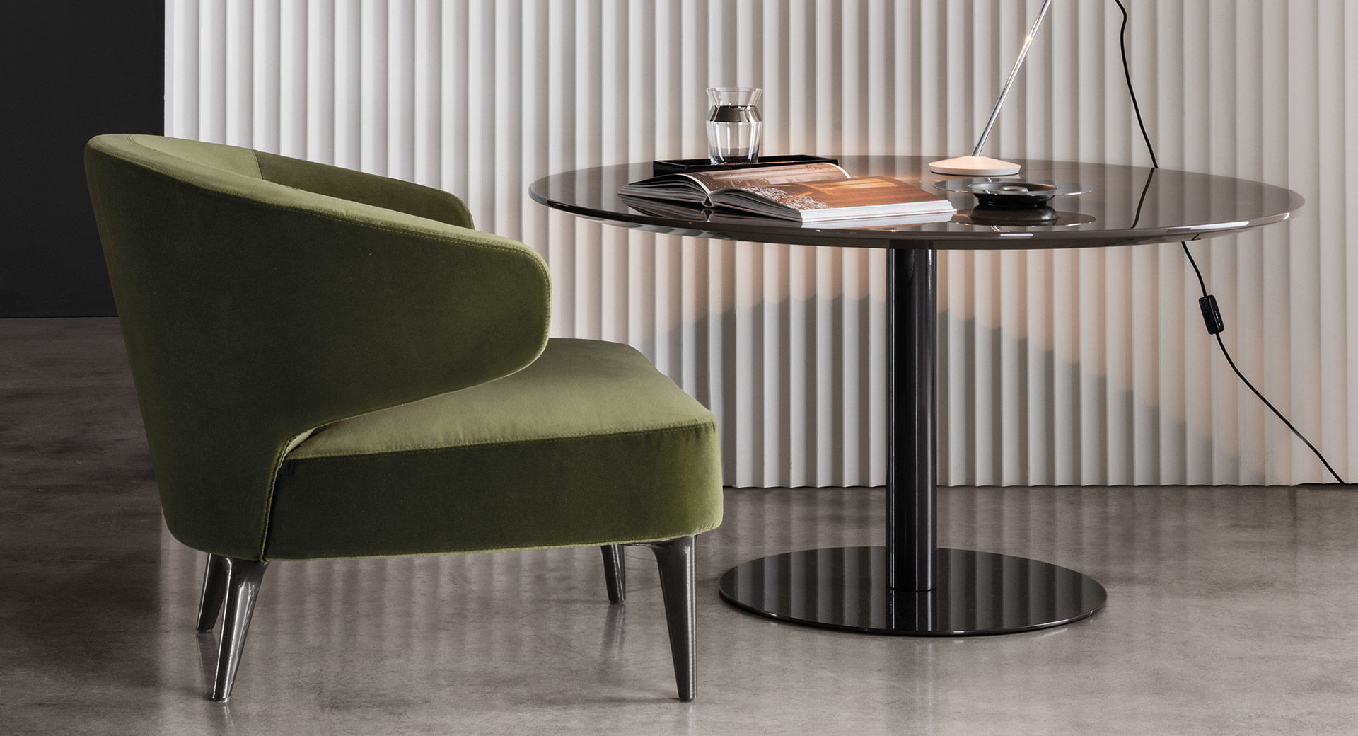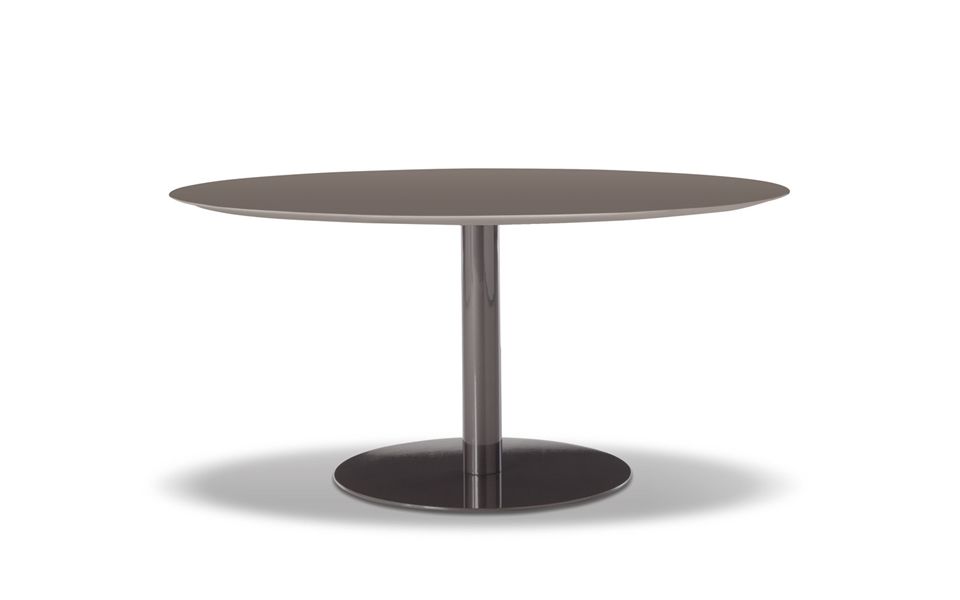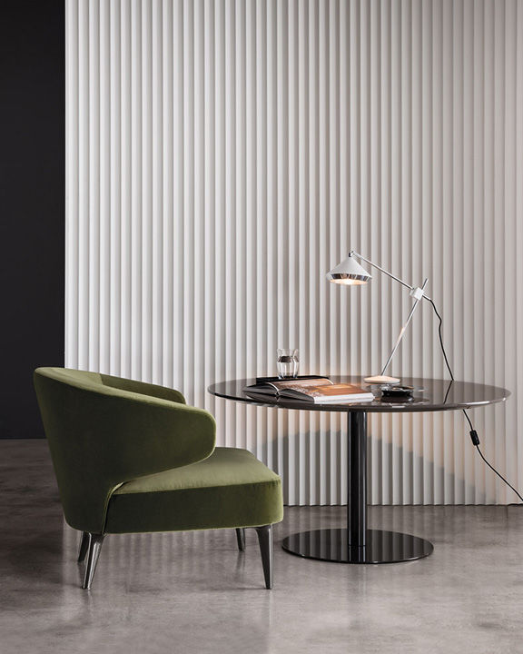Bellagio "Lounge"桌子有一个光滑的锡色涂漆金属底座,桌面有几种版本:卡拉卡塔大理石,乌木贴面和沙子或泥土光泽漆面。