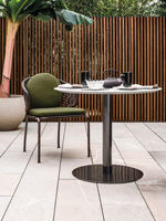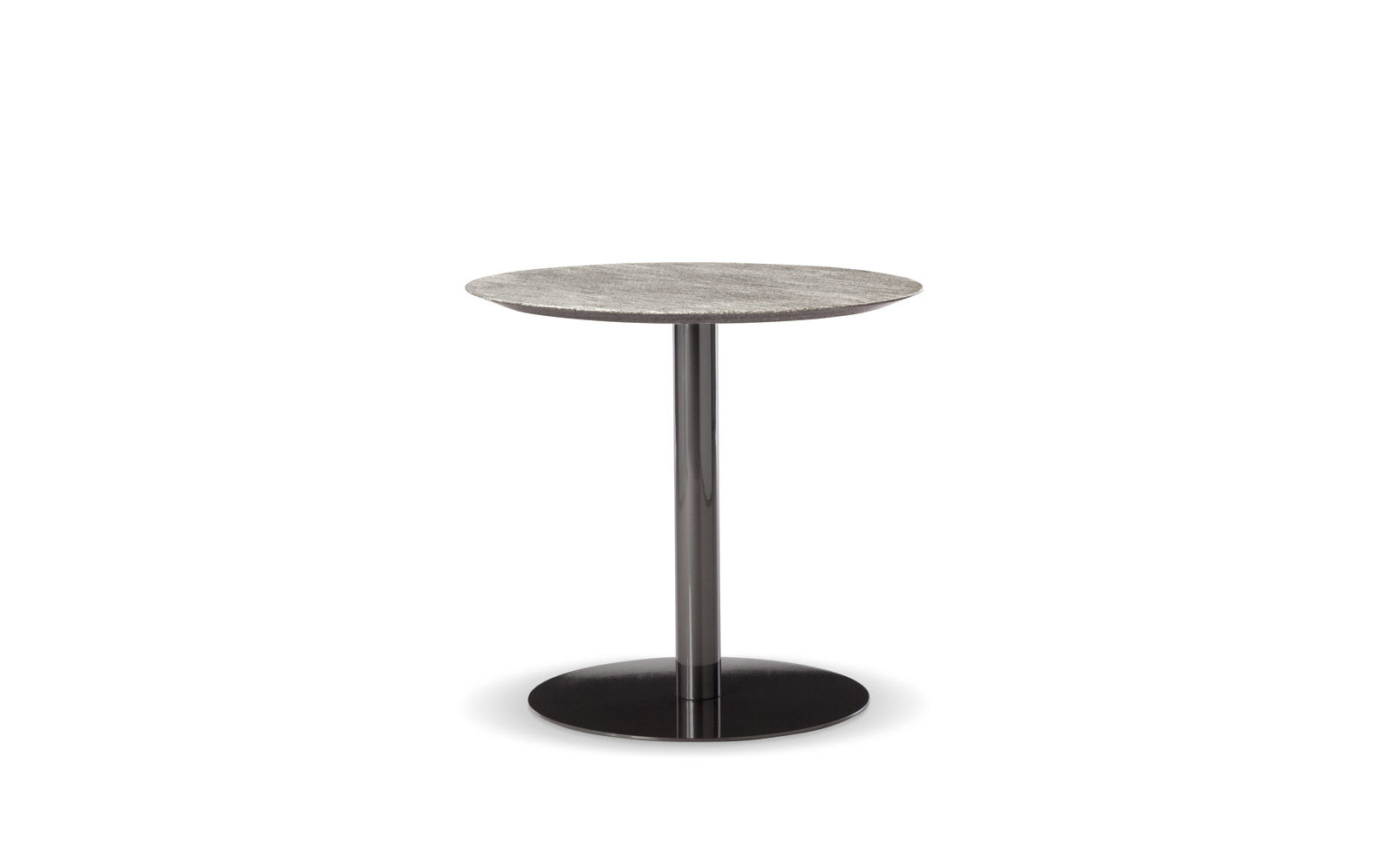 Bellagio户外桌子提供新版本,银色Beola斜面顶部和底座饰有外部锡色环氧涂层。