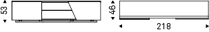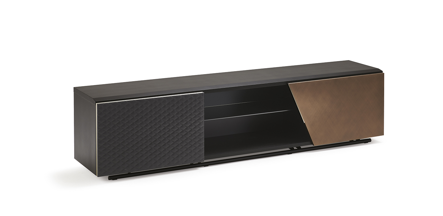 钛 (GF11) 或黑色 (GF73) 压纹漆木电视柜。钛 (GFM11) 或黑色 (GFM73) 压花钢底座。左门按照带有钛 (GFM11) 压花铝型材的样品卡采用合成皮革或软皮革覆盖和绗缝。右门采用卡纳莱托胡桃木 (NC)、烤橡木 (RB) 或拉丝青铜色,饰有黑色铬 (06) 细节。内部烟熏玻璃搁板。