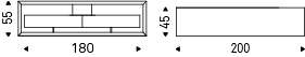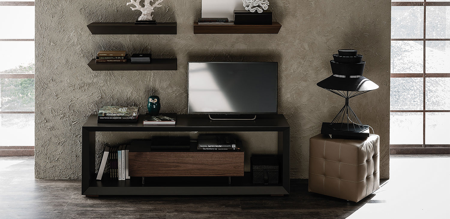 带石墨 (GF69) 或白色 (GF71) 压纹漆面框架的电视柜。卡纳莱托胡桃木 (NC)、白色 (GF71) 或石墨 (GF69) 压纹漆抽屉单元和门。160cm 版本带翻门,200cm 和 250cm 版本带翻门 (L) 和抽屉 (R)。