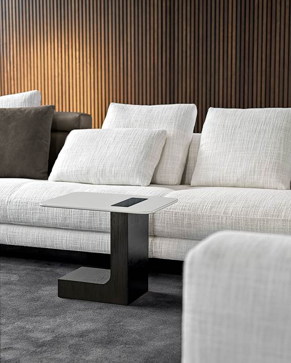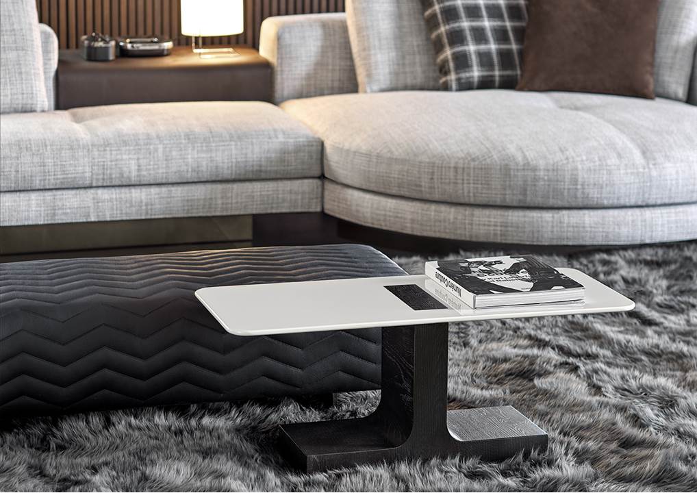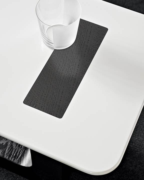 Block咖啡桌的底座采用实木块结构,被设想为"L"或倒置"T"形状的实心体积。在摩卡漆橡木中,它由顶部完成,使嫁接物以清晰的视野出现在表面上。