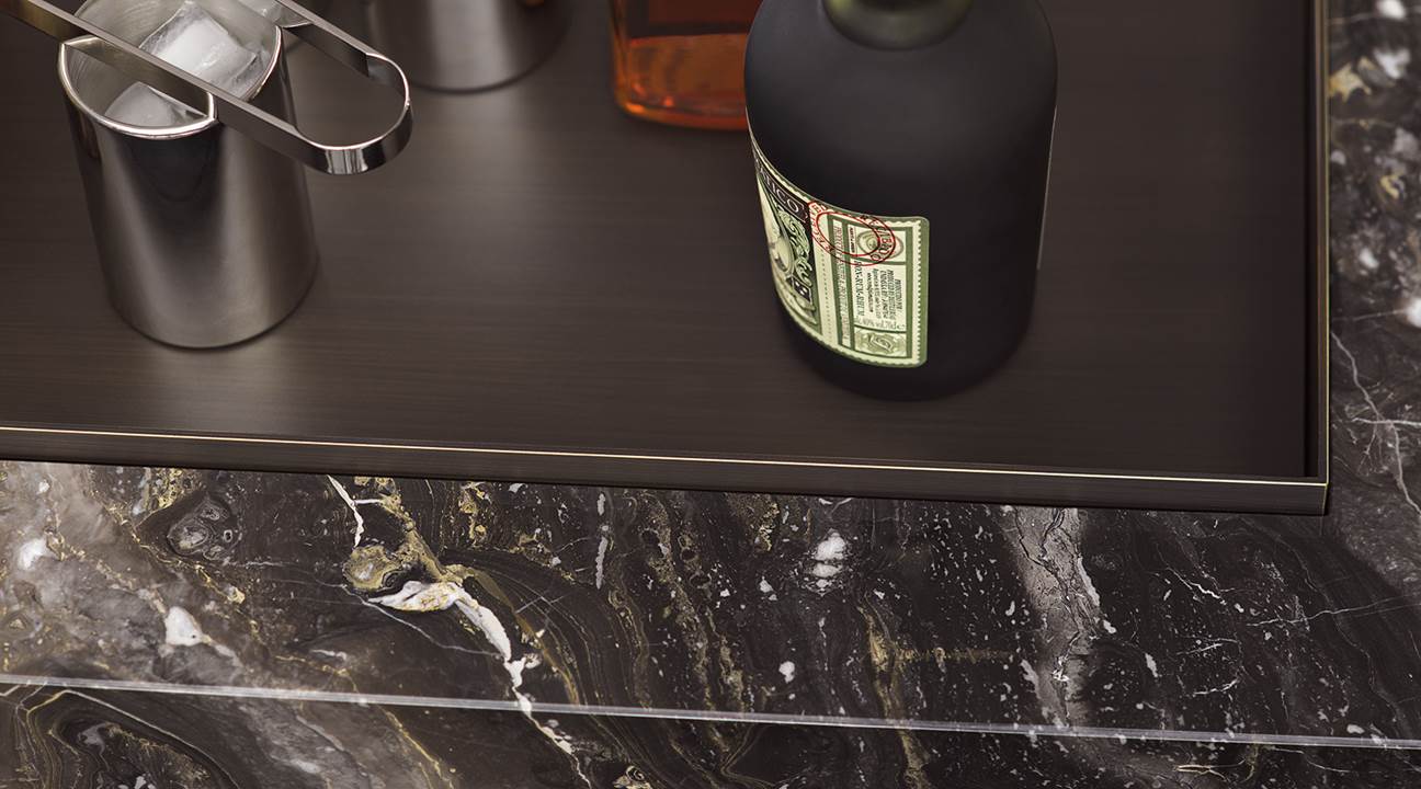 它们都采用哑光漆面的桉树木和哑光聚酯漆面的帕利桑德桑托斯,两者都与撒哈拉黑色大理石,哑光聚酯饰面相结合,覆盖内置托盘。
