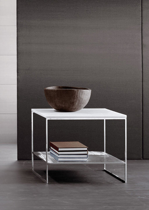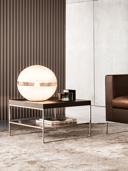 一个大家庭:一张低矮的咖啡桌和一张高的桌子,一个矩形和一个正方形;还开发了一个超大版本;一种专为灵活使用而设计的新型边桌。有几种上衣可供选择,所有上衣都具有相同的优良品质:Marquina和Afyon黑色大理石,乌木和橡木。纤薄的底座、清晰的几何形状和诗意的简约是整个系列的共同点。