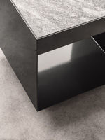 Elliott "Outdoor" 桌子的纯粹简约设计体现了对精致优雅材料的选择。金属框架采用专门处理用于户外的锡色涂料制成,顶部是细粒度的拉丝银Beola石。Elliott "Outdoor" 仅提供一种尺寸,并配有实用的内部储物箱。