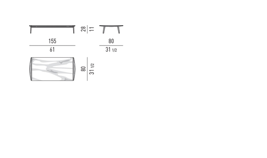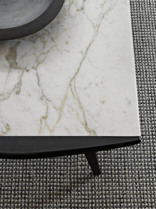 咖啡桌也与木制扶手共享相同的线条,木制扶手设计了一个轻微的曲线,在结构和侧面部分也可以找到。咖啡桌的中央部分通过卡拉卡塔大理石顶部的存在而得到增强,创造了一种复杂的材料组合。