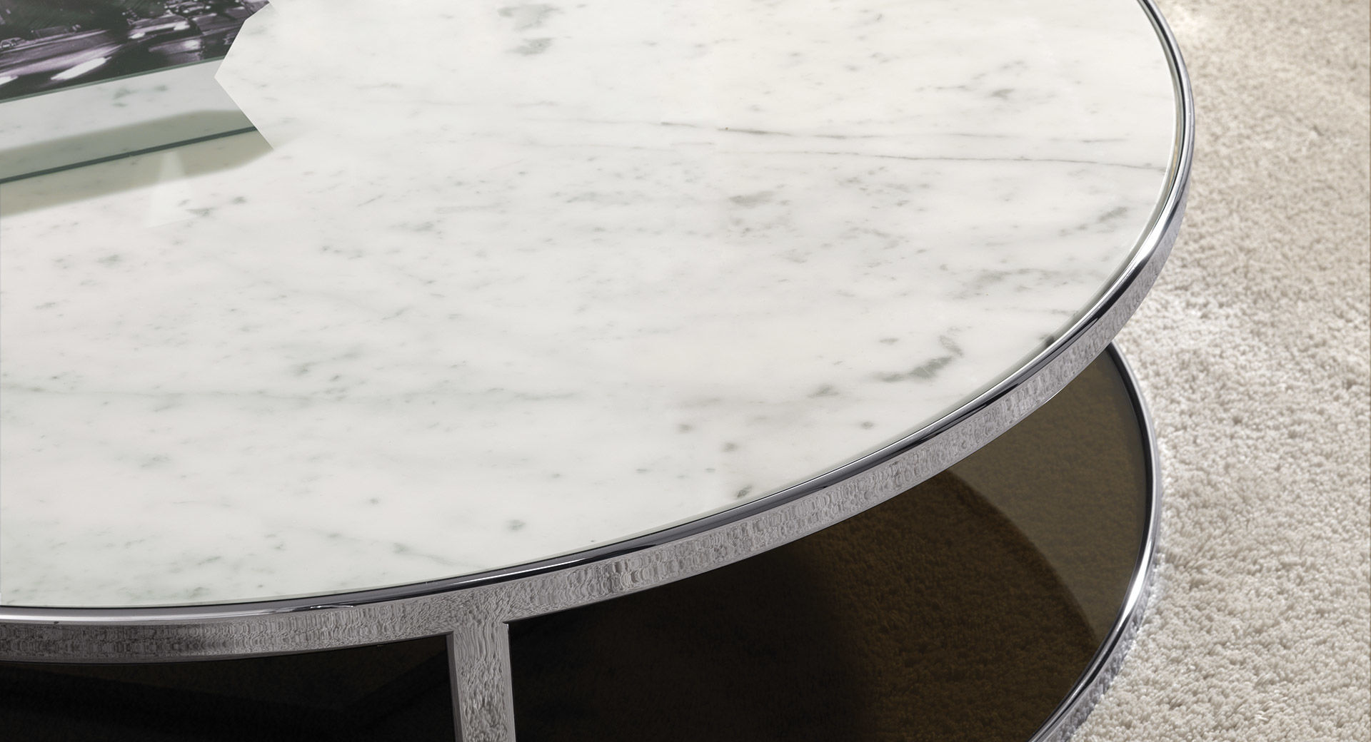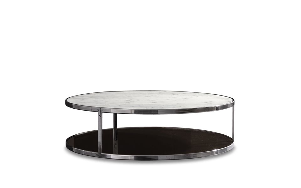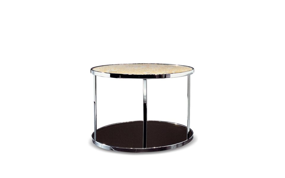 上方和下方:两个可更换的表面 - 圆形或方形 - 彼此面对面,而不会接触。两个顶部远程互动,涉及伊特鲁里亚玛瑙,白色雕像大理石,卡拉卡塔大理石,漆木,青铜色玻璃,由简单的镀铬金属框架支撑。这就是优雅的生机。