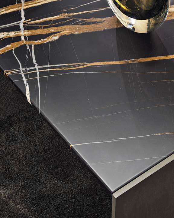 具有哑光黑色漆面的分层轴承结构具有薄铝制侧面,带有上漆的金棕色饰面和Grigio Orobico或Sahara Noir大理石,哑光聚酯饰面的顶部。