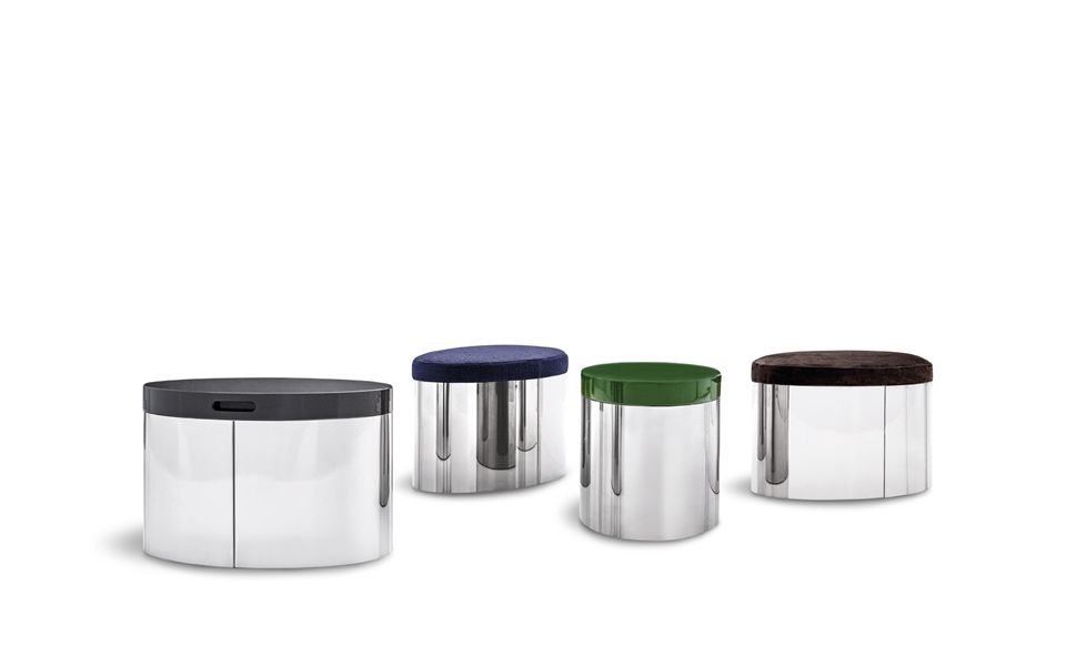 这个真正独特的物品也是雷蒙德系列的一部分。它可以用作偶尔的桌子和座椅,隐藏了内部实用杂志存储的空间。容器的底部是个性化的黑色马鞍皮覆盖物,上面压花着Minotti徽标。上半部分有白色,沙色,花岗岩,绿色和紫色光泽漆面,并具有实用的嵌入式椭圆形手柄,使提升盖子毫不费力。脚凳版本的顶部采用独家Minotti系列的皮革衬垫和软垫。