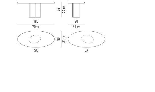 Raymond 也是一张独特的办公桌,有两种高度:61 厘米和 74 厘米。白色,沙色,花岗岩,绿色和紫色的光泽漆面椭圆形顶部可以添加到椭圆形镀铬金属底座中。