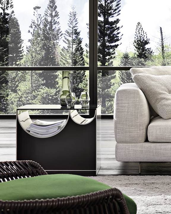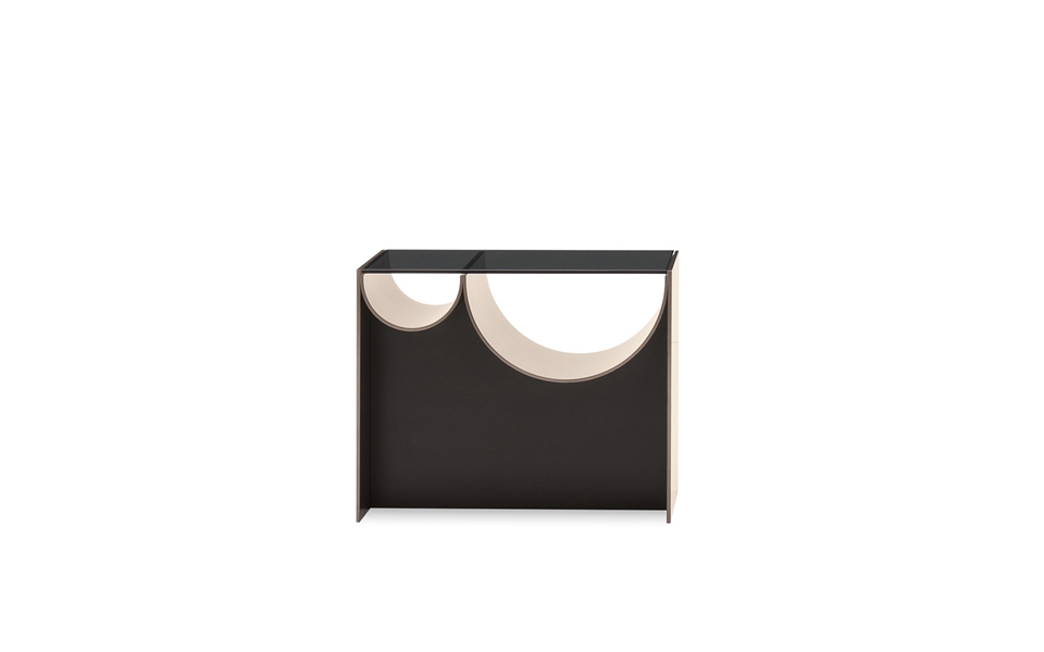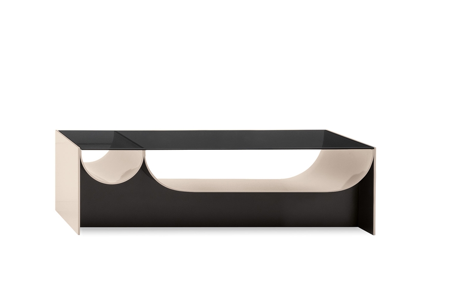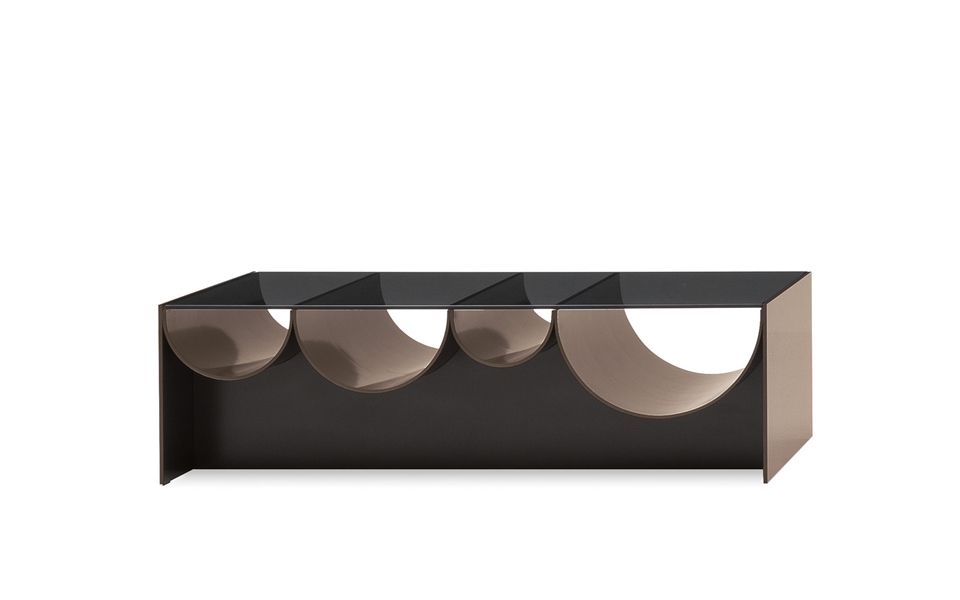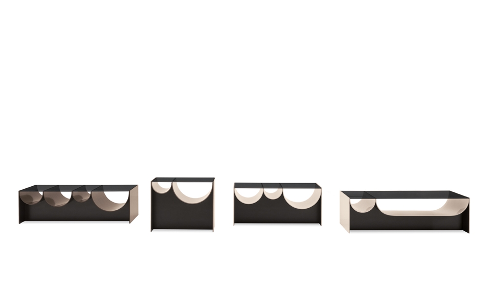 Waves咖啡桌直接参考了海洋起伏的轮廓,由烟熏灰色玻璃顶部组成,该玻璃顶部由彩绘铝结构支撑 - 外部为沙色或青铜色,内部为锡制色调。
