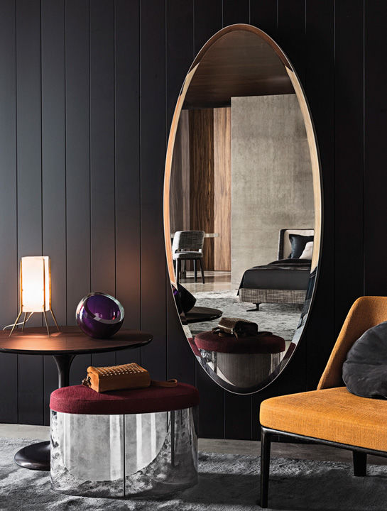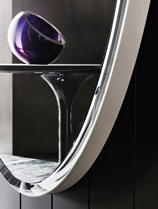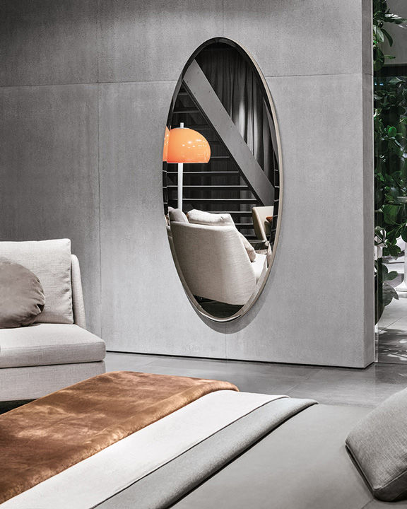 Murray是一面透明的椭圆形镜子,带有斜边,安装在沙色的漆面面板上。它还可提供光泽的漆皮贴板。它配有双安装座,可以悬挂在水平或垂直位置,从而增加了其使用的可能性。