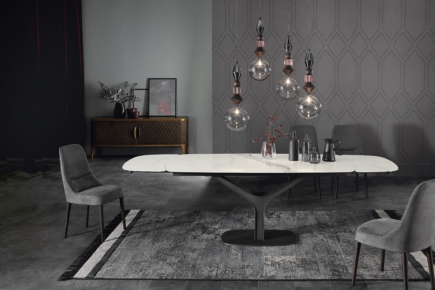新当代:托宁·卡萨 (Tonin Casa) 提出的新阿里斯顿桌的最佳定义。 得益于形成这张桌子底座的曲线,钢材的硬度在这里变得柔软而灵活。玻璃、陶瓷或瓷器台面,可提供所有 Tonin Casa 饰面,安全地放置在铝制轨道上,旨在 结合优雅和功能。