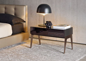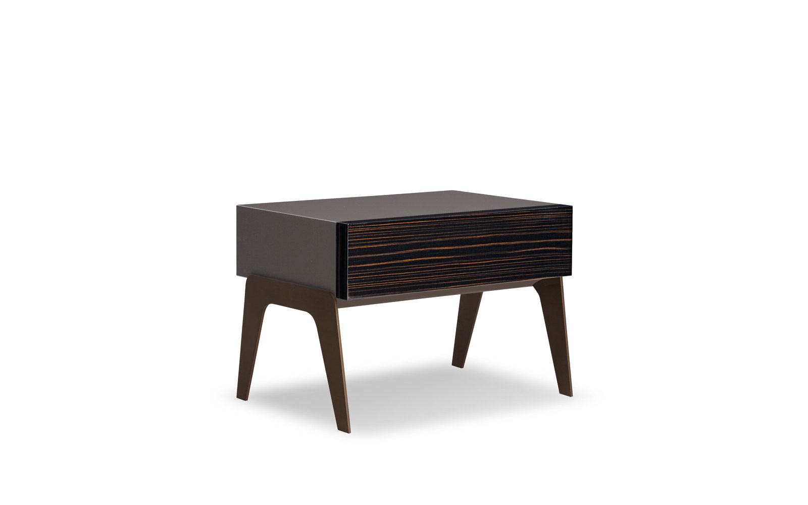 Kirk 床头柜饰有优雅的金属支腿,采用青铜漆面饰面,顶部饰有亮漆花岗岩饰面,抽屉正面饰有亮泽的乌木色。