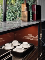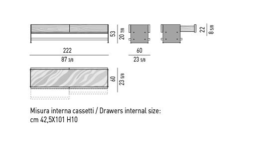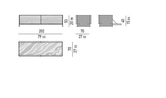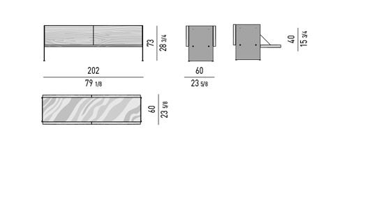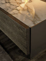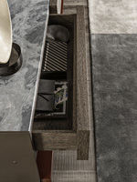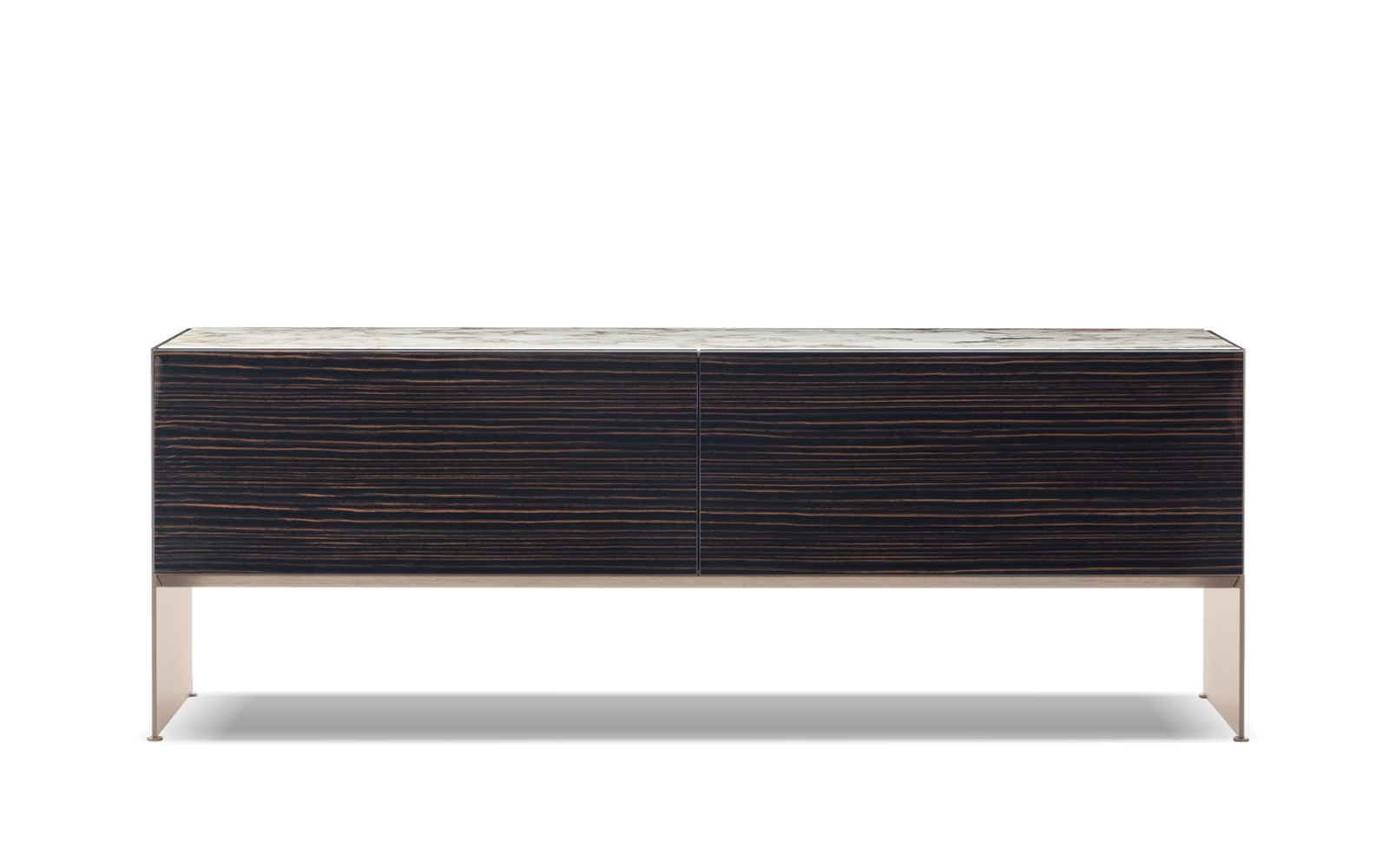 结构是MDF,带有水貂色的Sucupira木贴面,或开孔漆乌木。容器的侧面矗立在地板上,由青铜色的缎面抛光金属制成。顶部有Bardiglio Nuvolato大理石或Calacatta大理石可供选择,两者都适合齐平的结构。