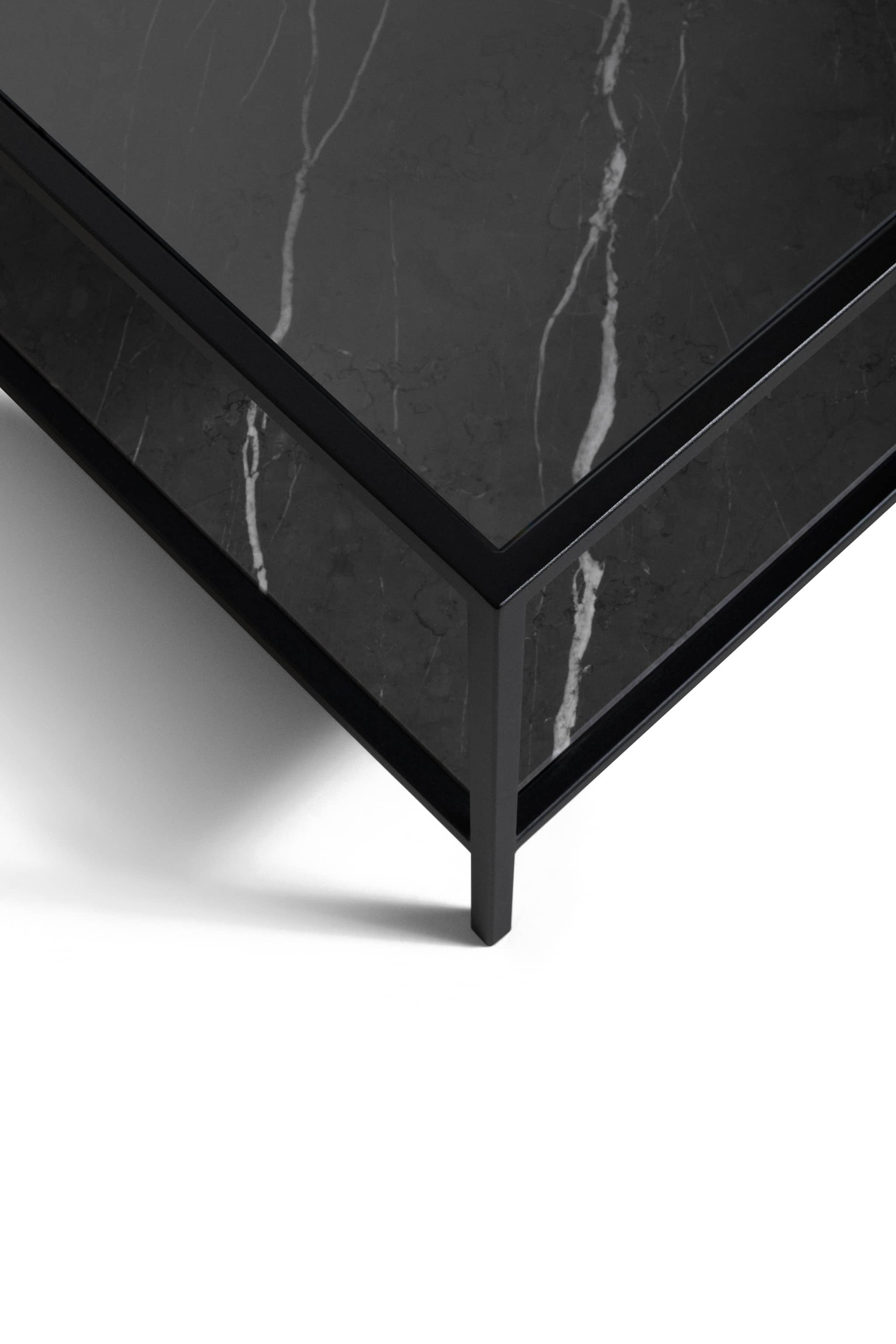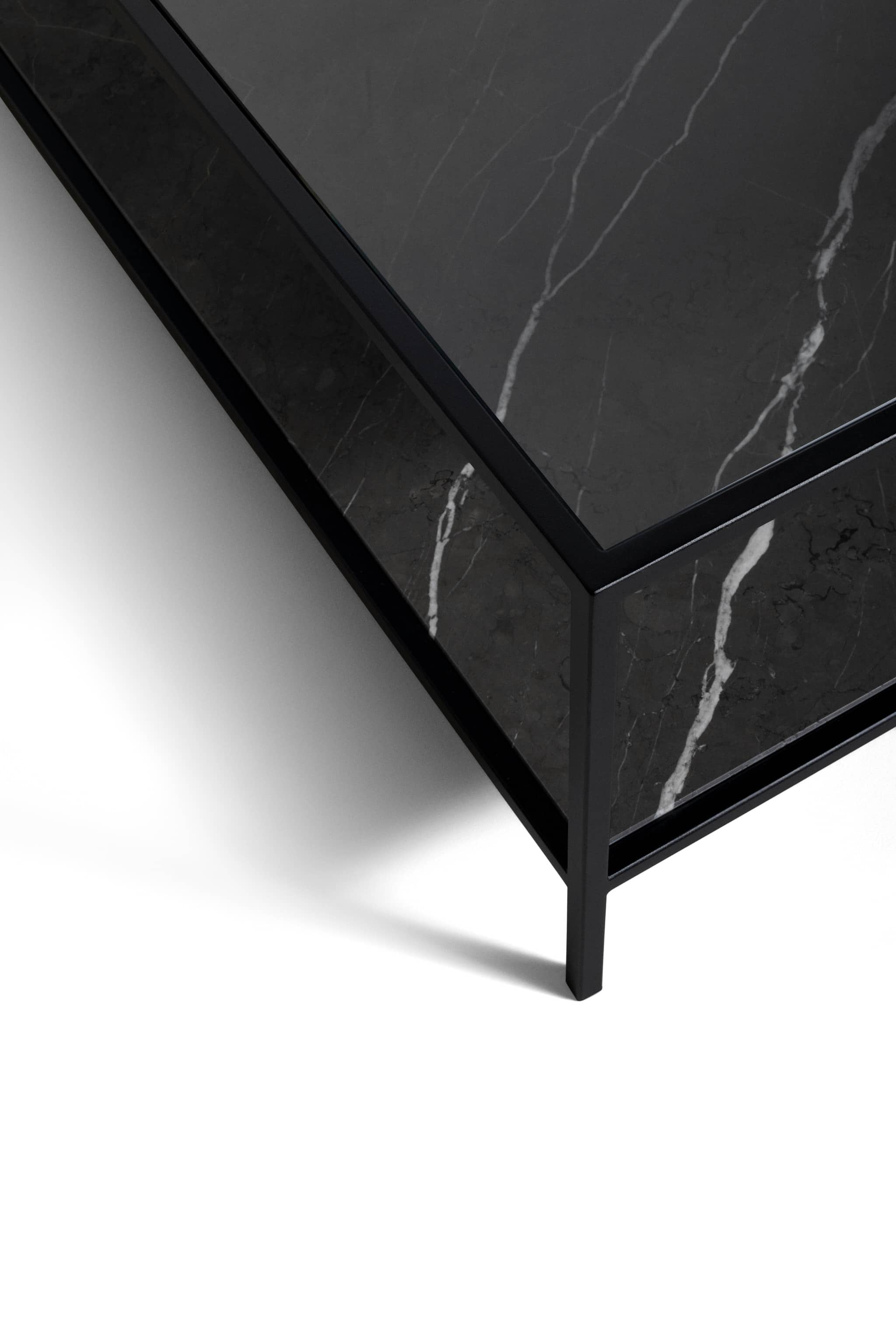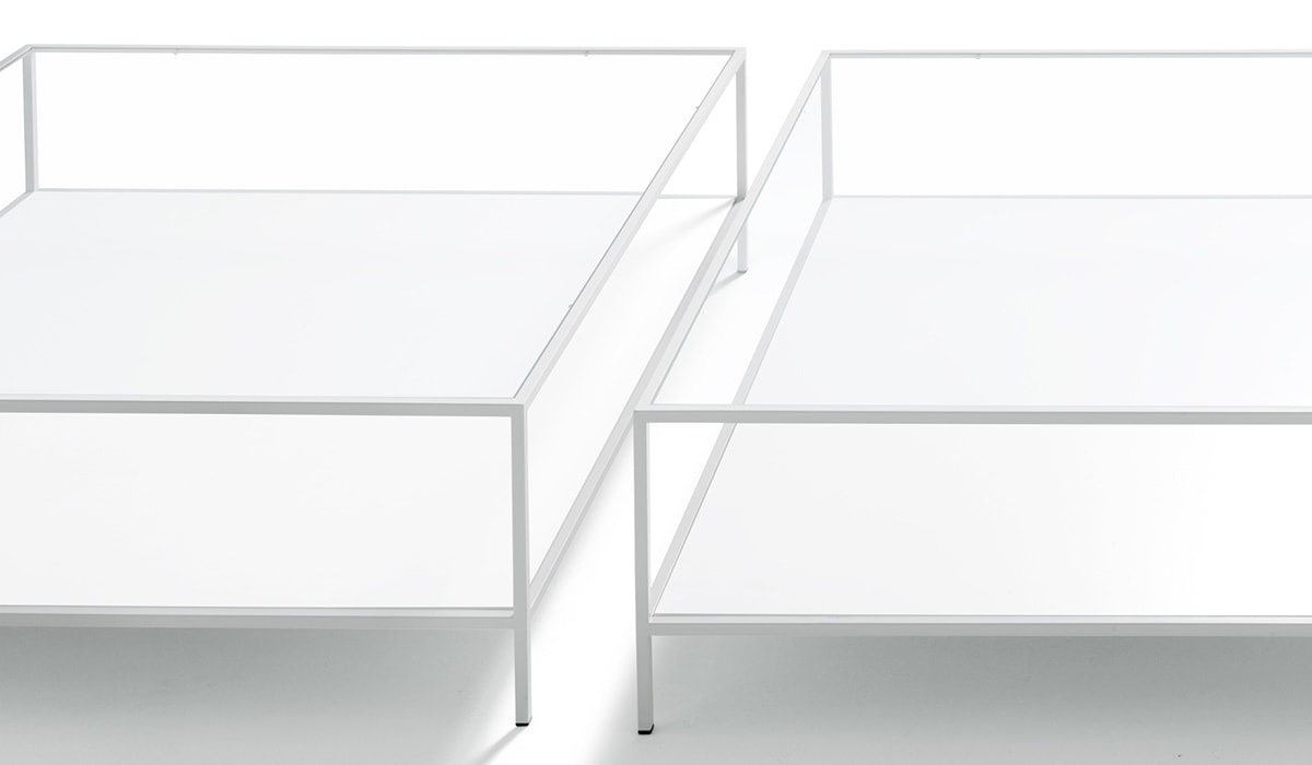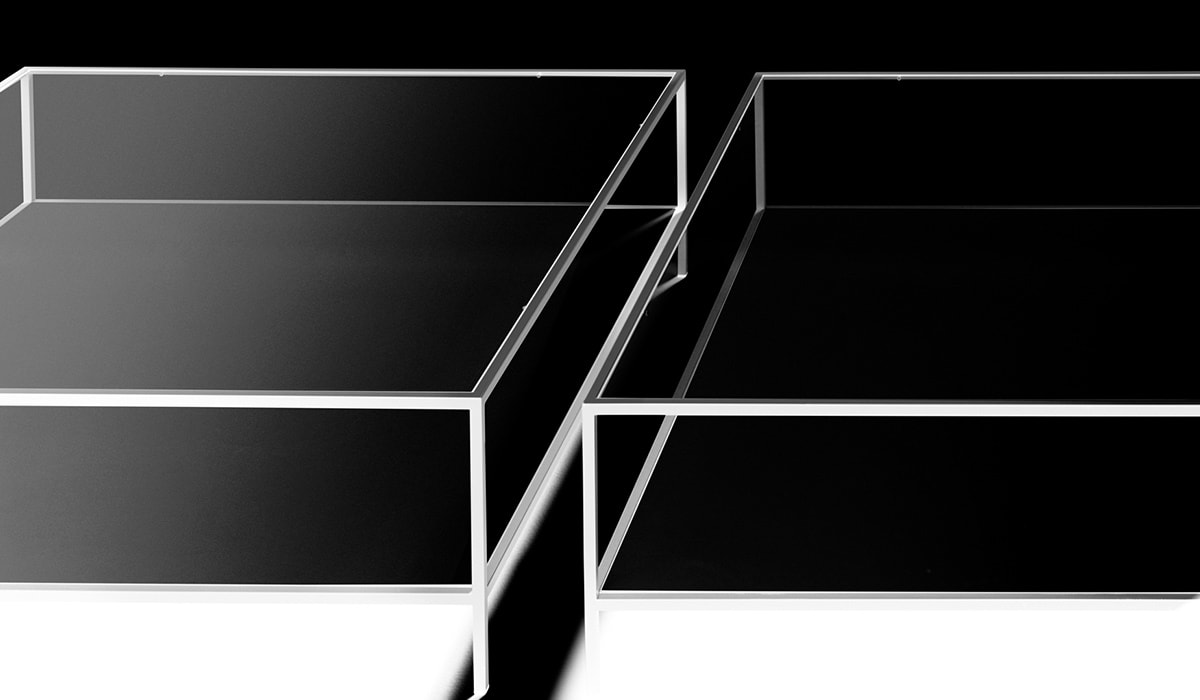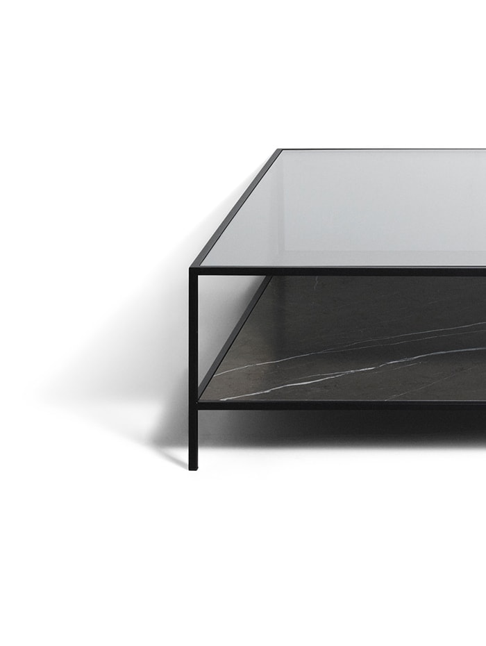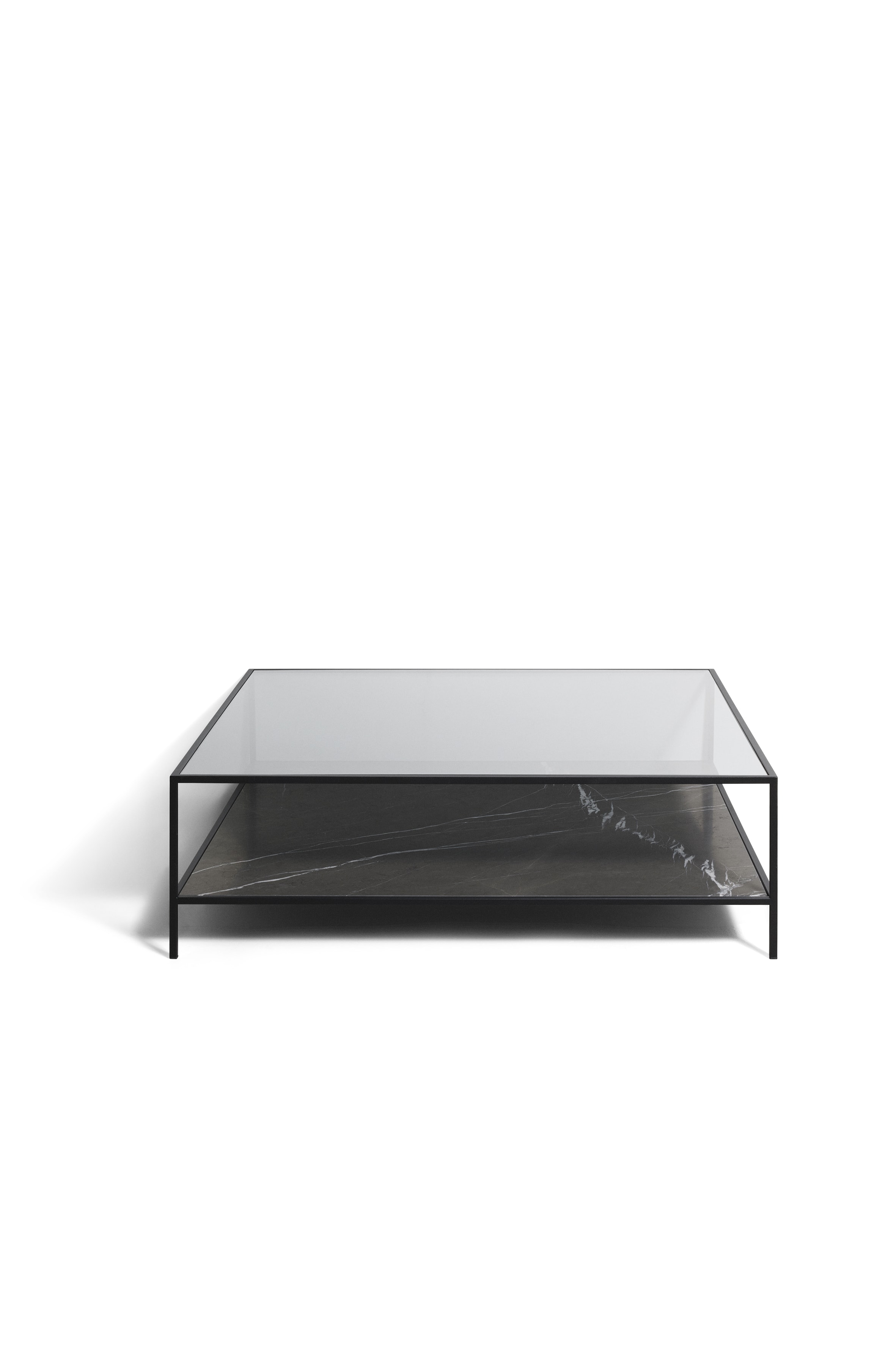 这个方形咖啡桌被设计成一杯咖啡,艺术书籍甚至雕塑的表面。方形管状结构支撑白色或黑色木材,大理石或MDI复合材料的下部搁板,其中物体受到保护但在众目睽睽之下,而顶部由玻璃或灰色烟熏超轻玻璃制成,具有绝对轻盈的效果。方形框架采用管状钢制成,涂有哑光白色或压花黑色的环氧聚酯粉末涂料。