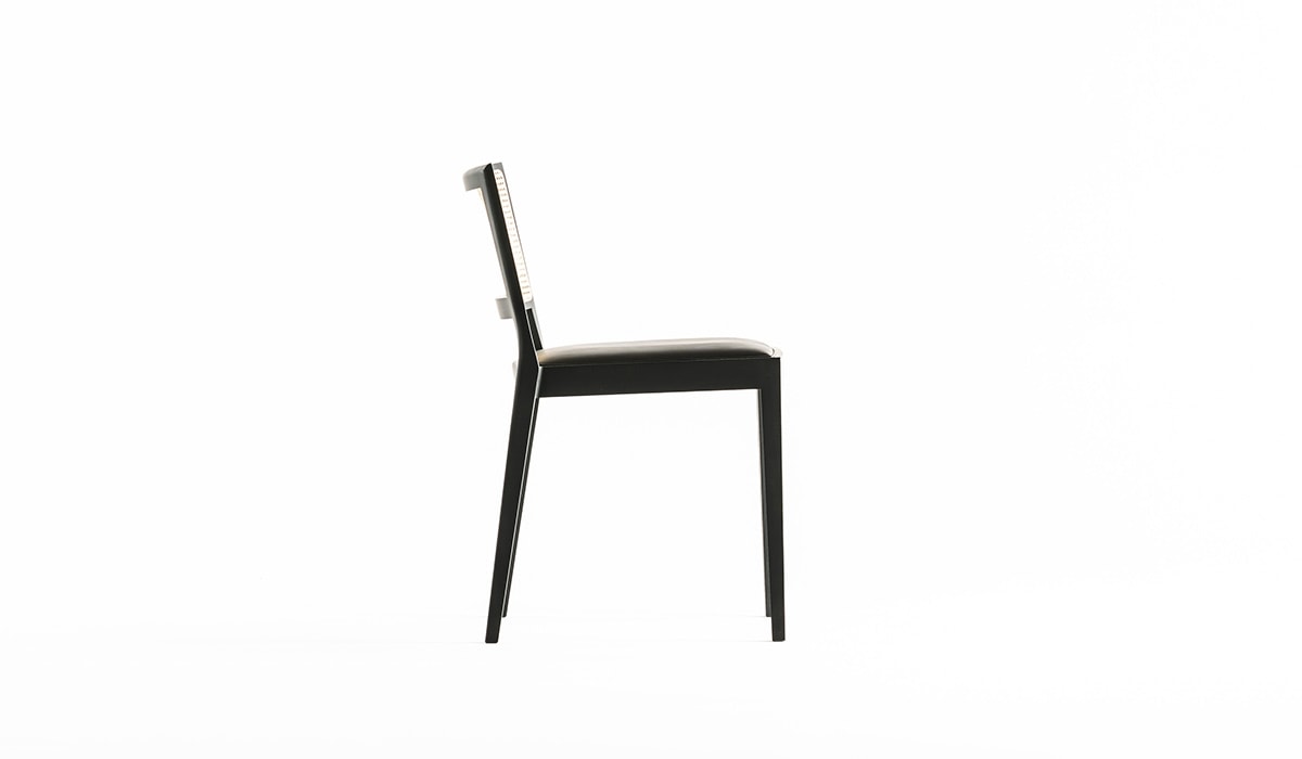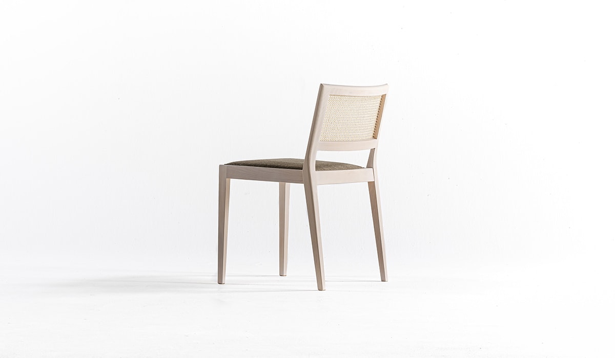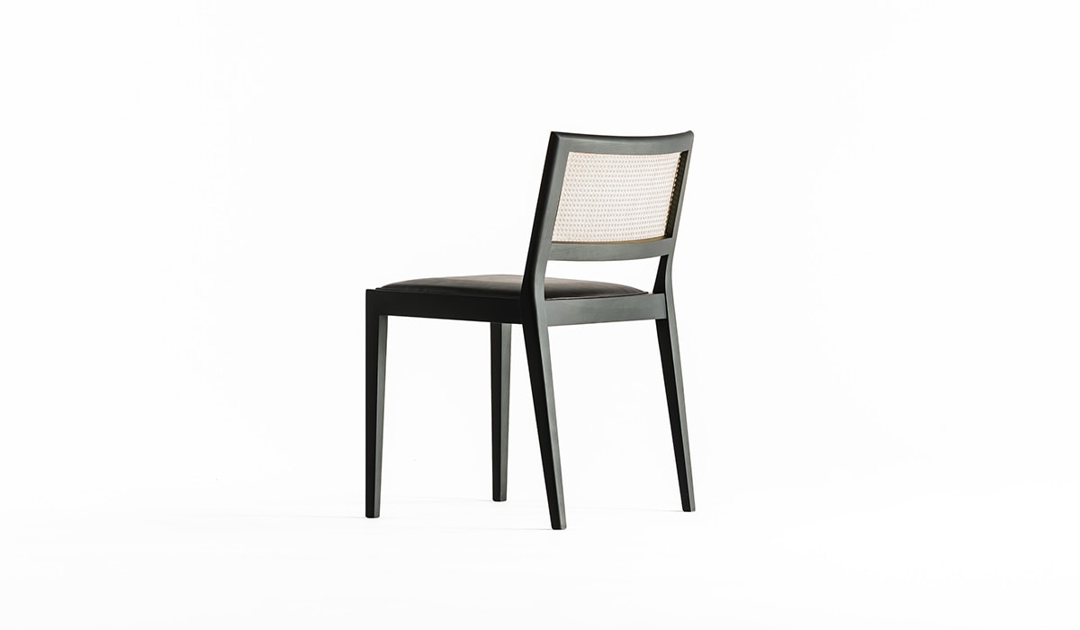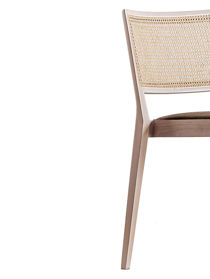 框架采用雪白或灰色木炭染色的实心山毛榉木;带衬垫的座椅,带灰色织物或深棕色皮革套;稻草靠背,天然甘蔗树皮。
